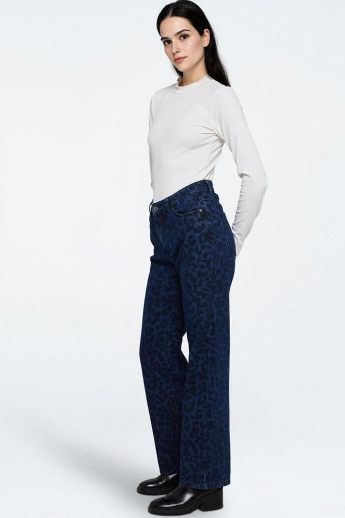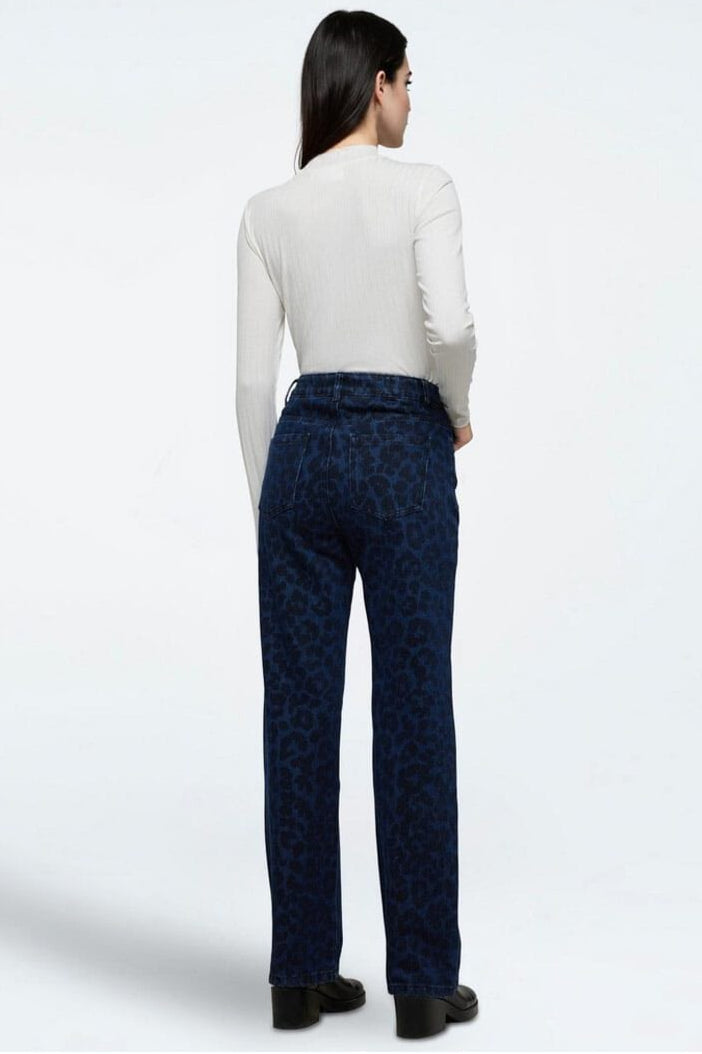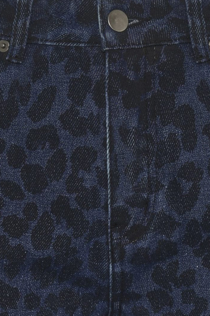 Donkerblau jeans van Moves by Minimum met luipaardprint. De broek heeft een rechte pasvorm en enkel lengte met hoge taille.