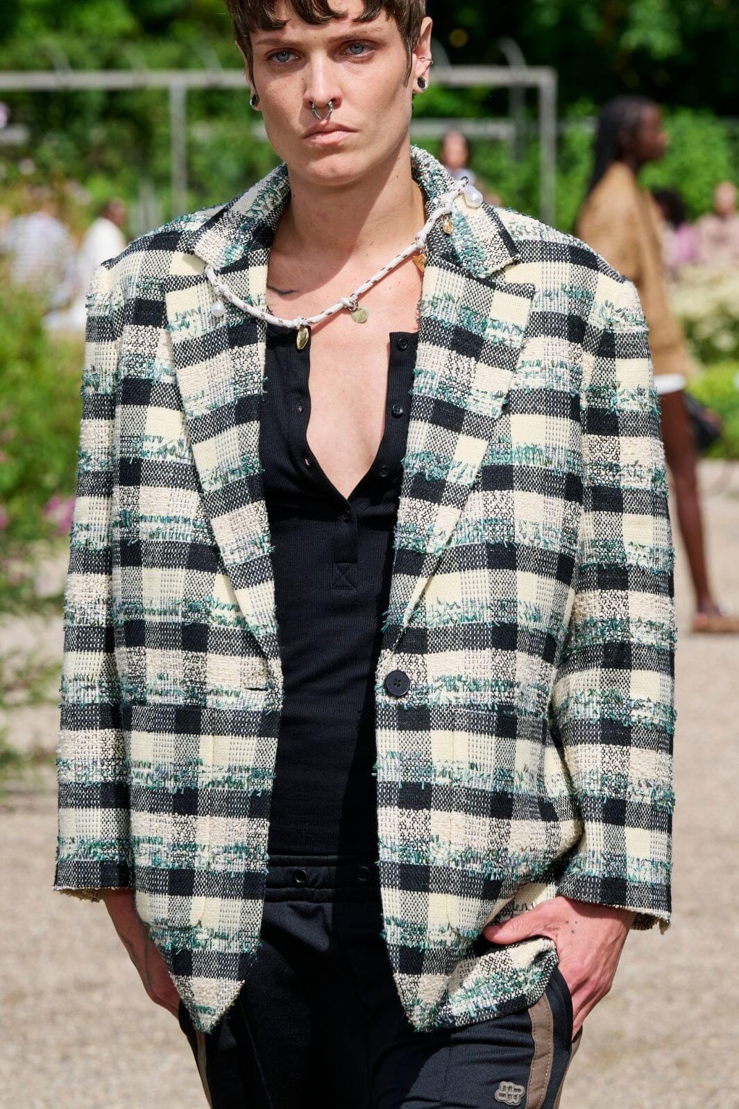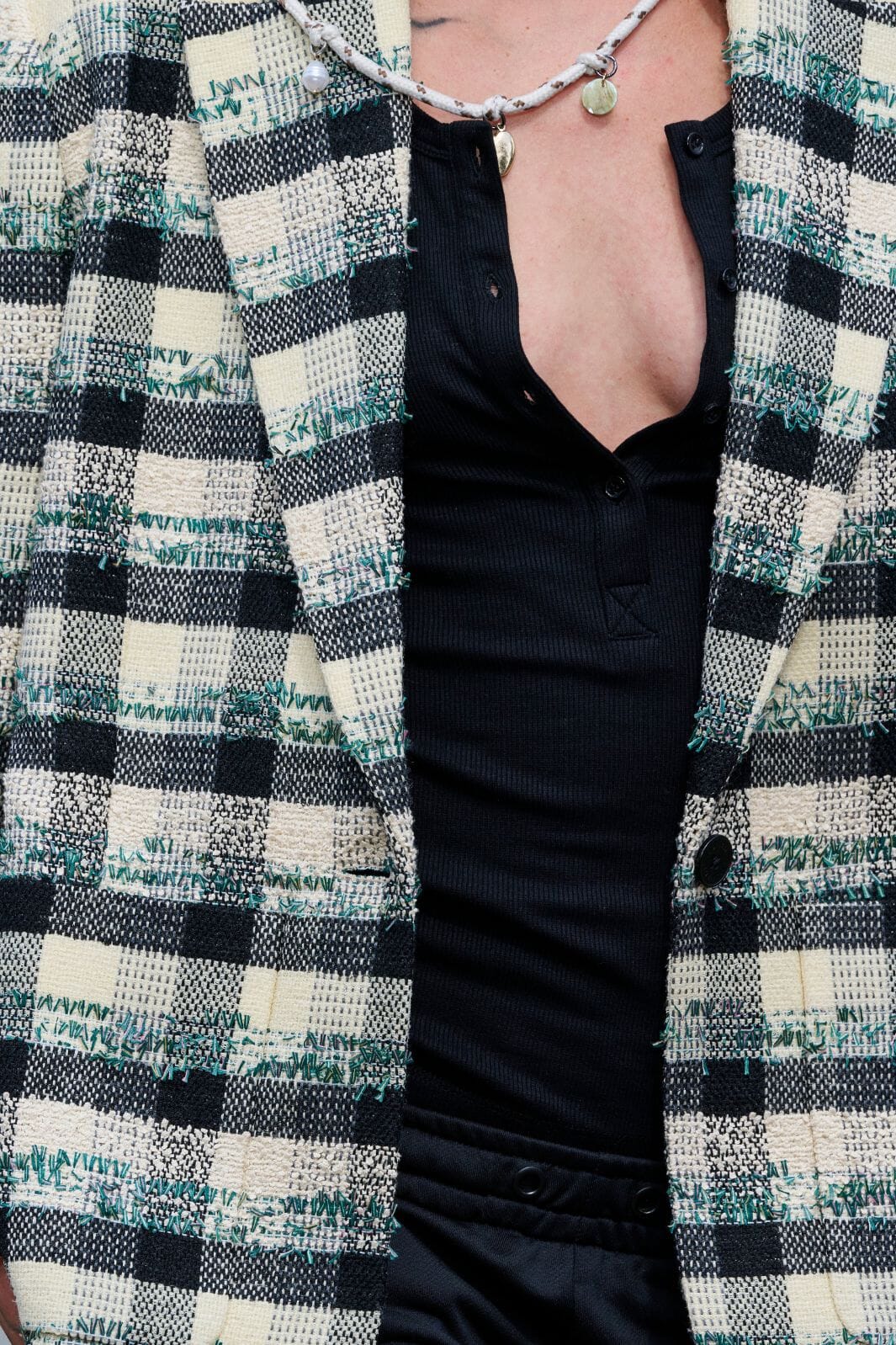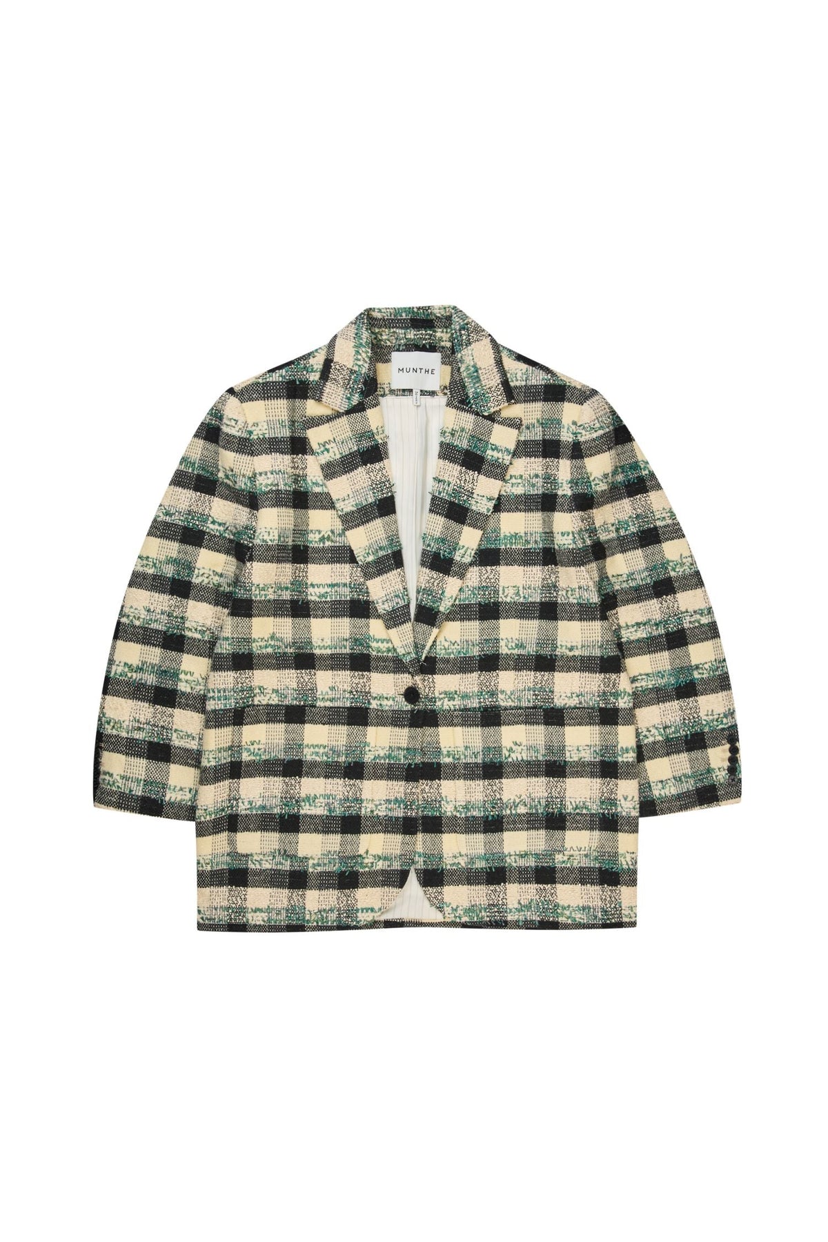Geruite blazer van Munthe in zwart, crème en wit. De blazer heeft een licht oversized pasvorm en is gemaakt van een zachte, geweven kwaliteit met 53% polyester, 33% acryl en 14% wol.