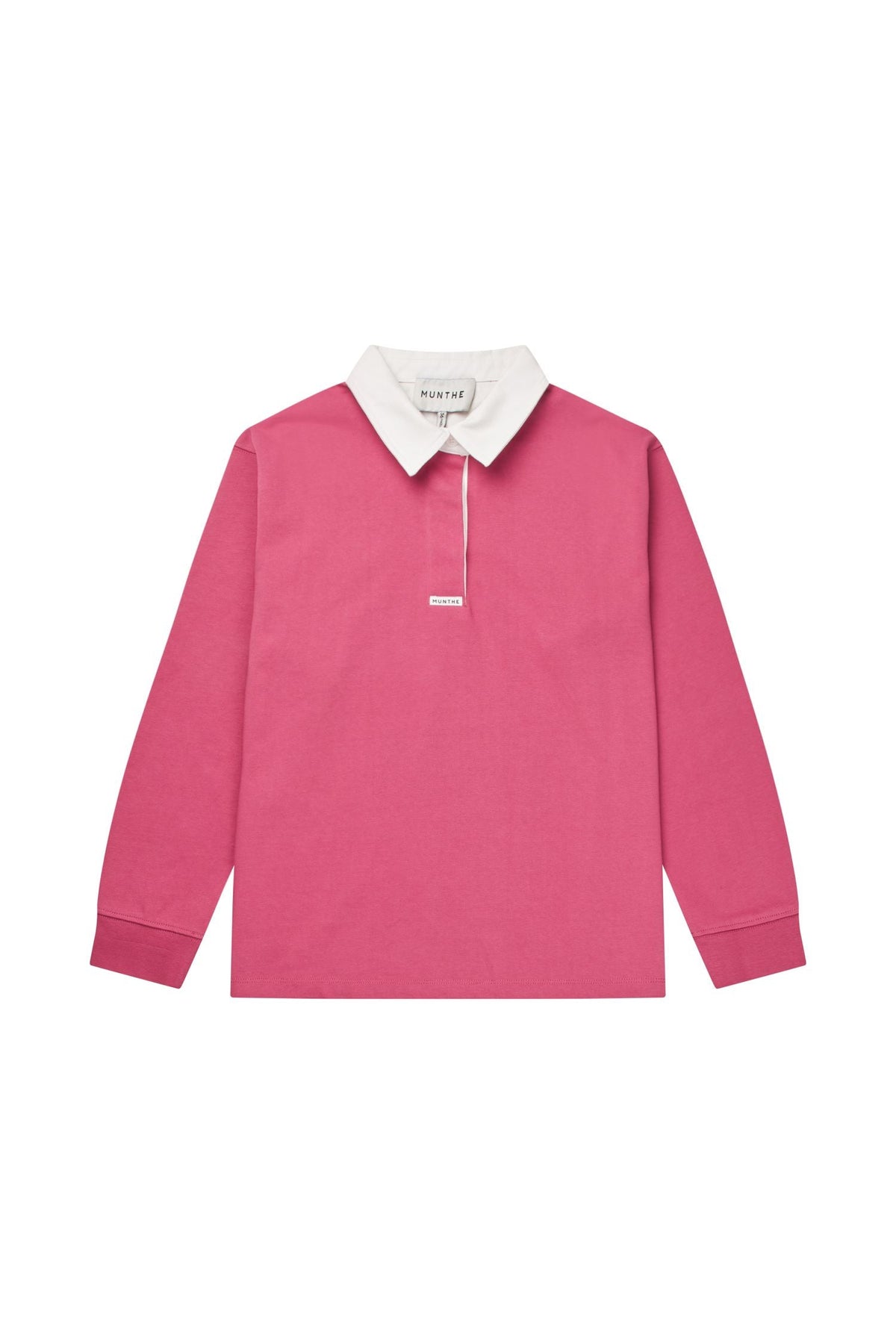 Lange mouwen poloshirt van Munthe in een roze-paarse bessenkleur. Het shirt heeft witte details aan de kraag en manchetten.