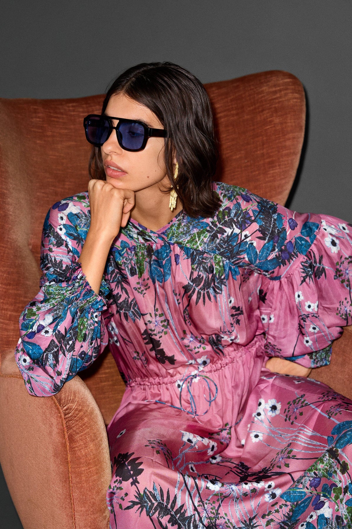Lang mouwjurk van Munthe, gemaakt van een mix van viscose en zijde. De jurk heeft een bloemenprint in roze en bessentinten met een losse pasvorm.