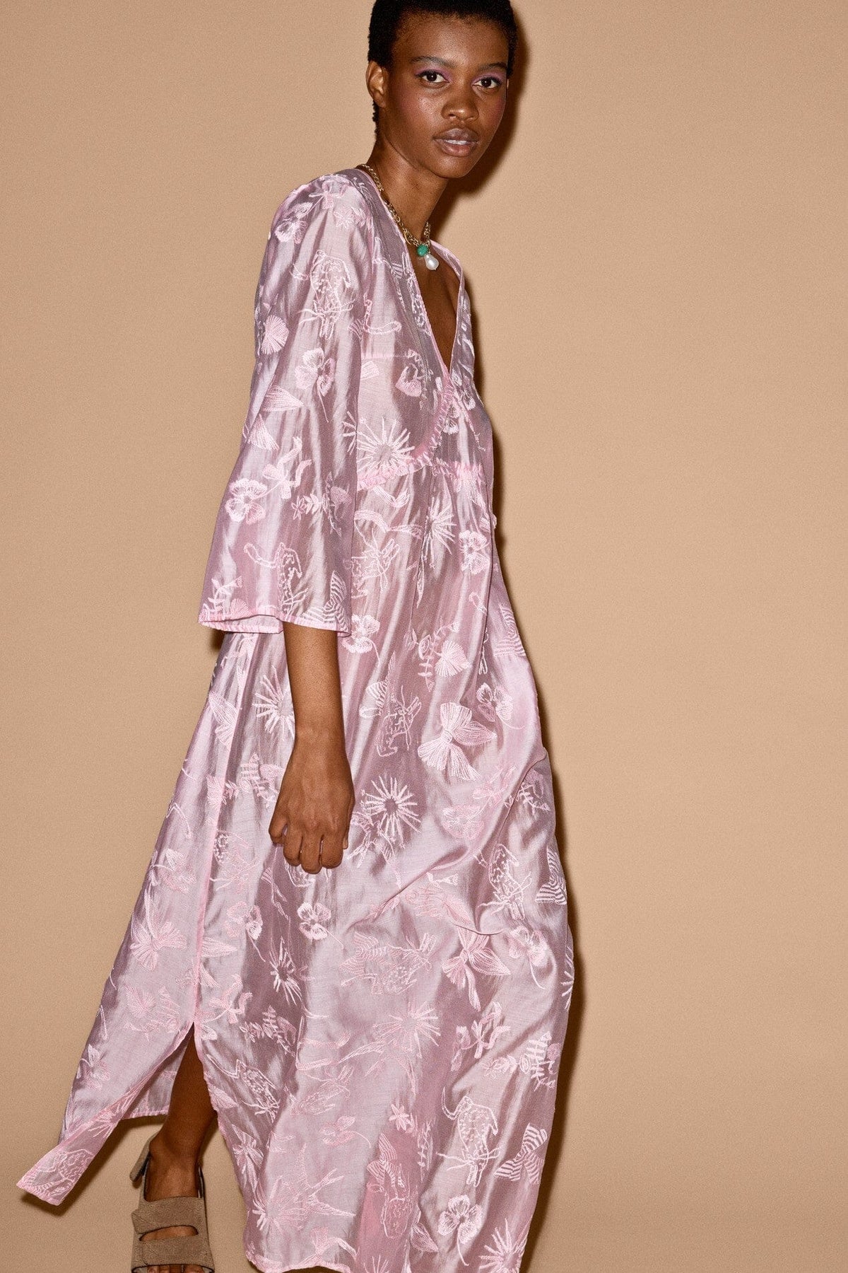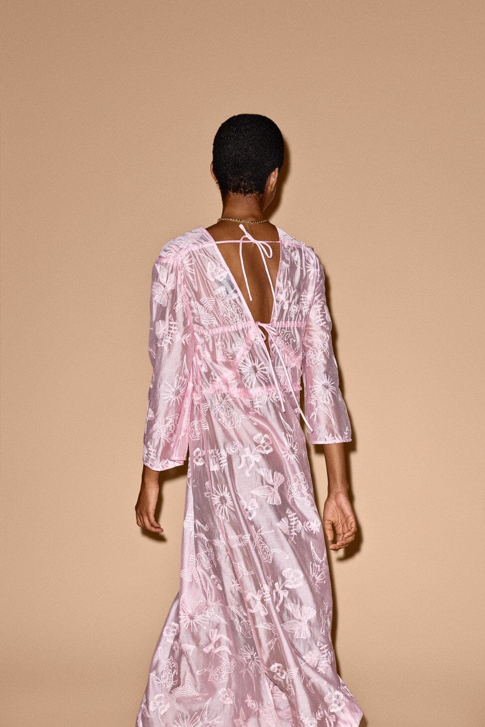 Roze jurk van Munthe met borduursel en een ton-sur-ton botanisch patroon. De jurk heeft een diepe V-hals zowel aan de voor- als achterkant en een strikdetail in de nek.