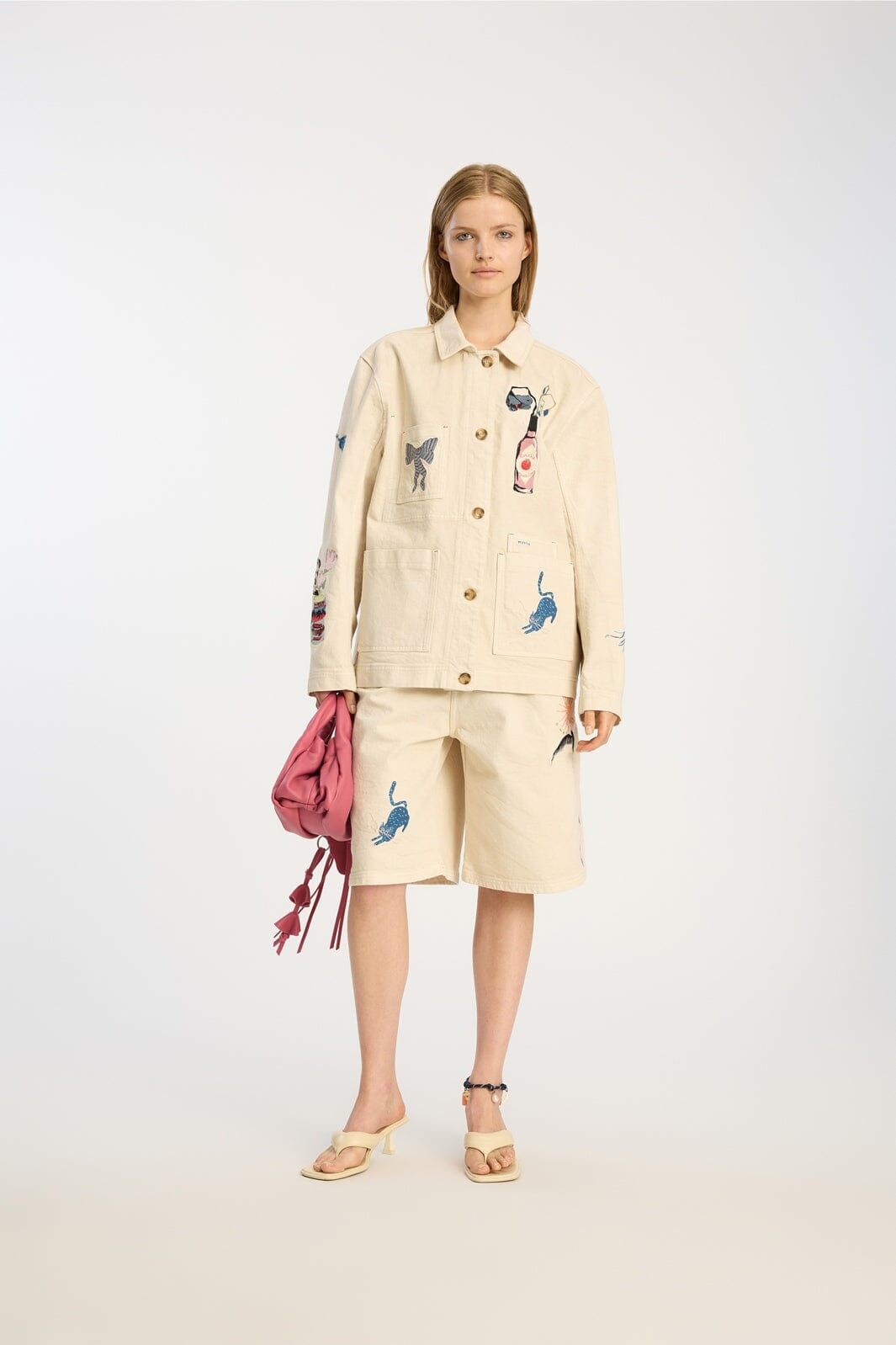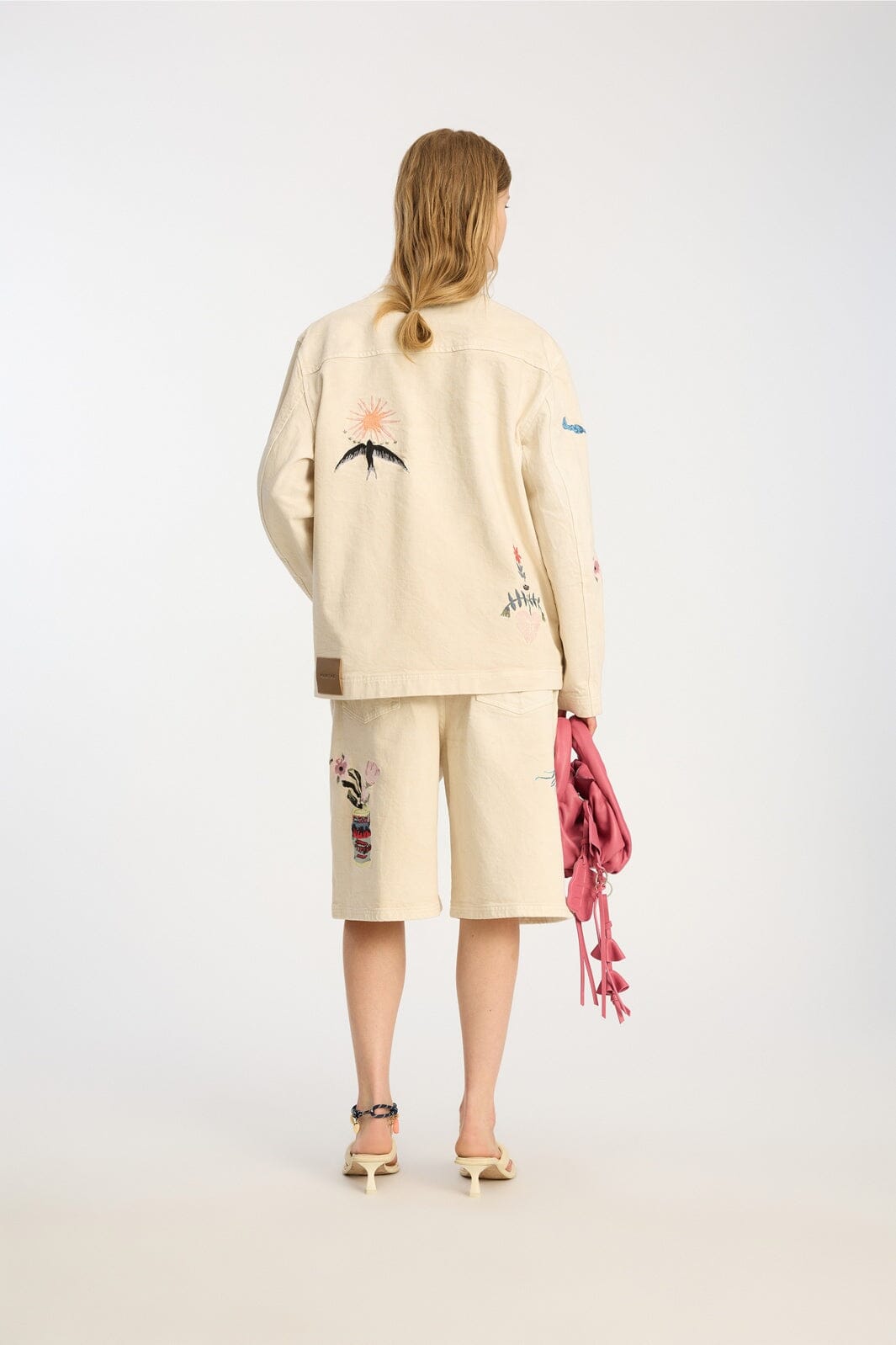 Beige jasje van Munthe, gemaakt van 99% biologische katoen en 1% elastaan. Het jasje heeft een losse pasvorm en is versierd met meerdere geborduurde motieven.