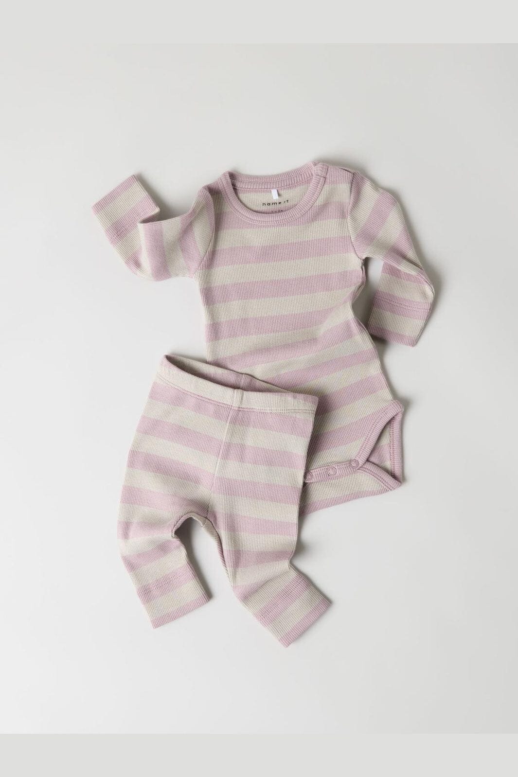 Ribgebreide leggings van Name It met strepen in beige en lichtroze. Het strakke ontwerp heeft een elastische taille en reikt tot de enkel.