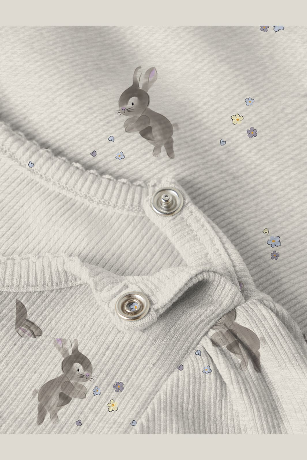 Lange mouw romper van Name It met een print van kleine konijnen en bloemen op een beige gemêleerde ondergrond. Geribde stof heeft een verticale, gestreepte structuur.