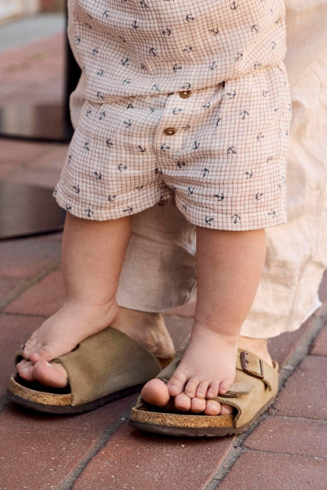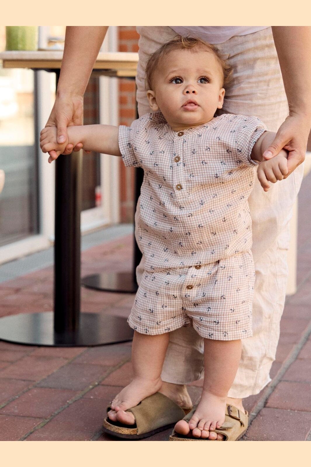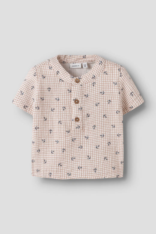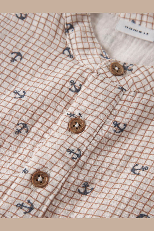 Beige shorts van Name It van 100% katoen. De shorts hebben een ruitpatroon met kleine ankerprints en een elastische taille met knoopsluiting.