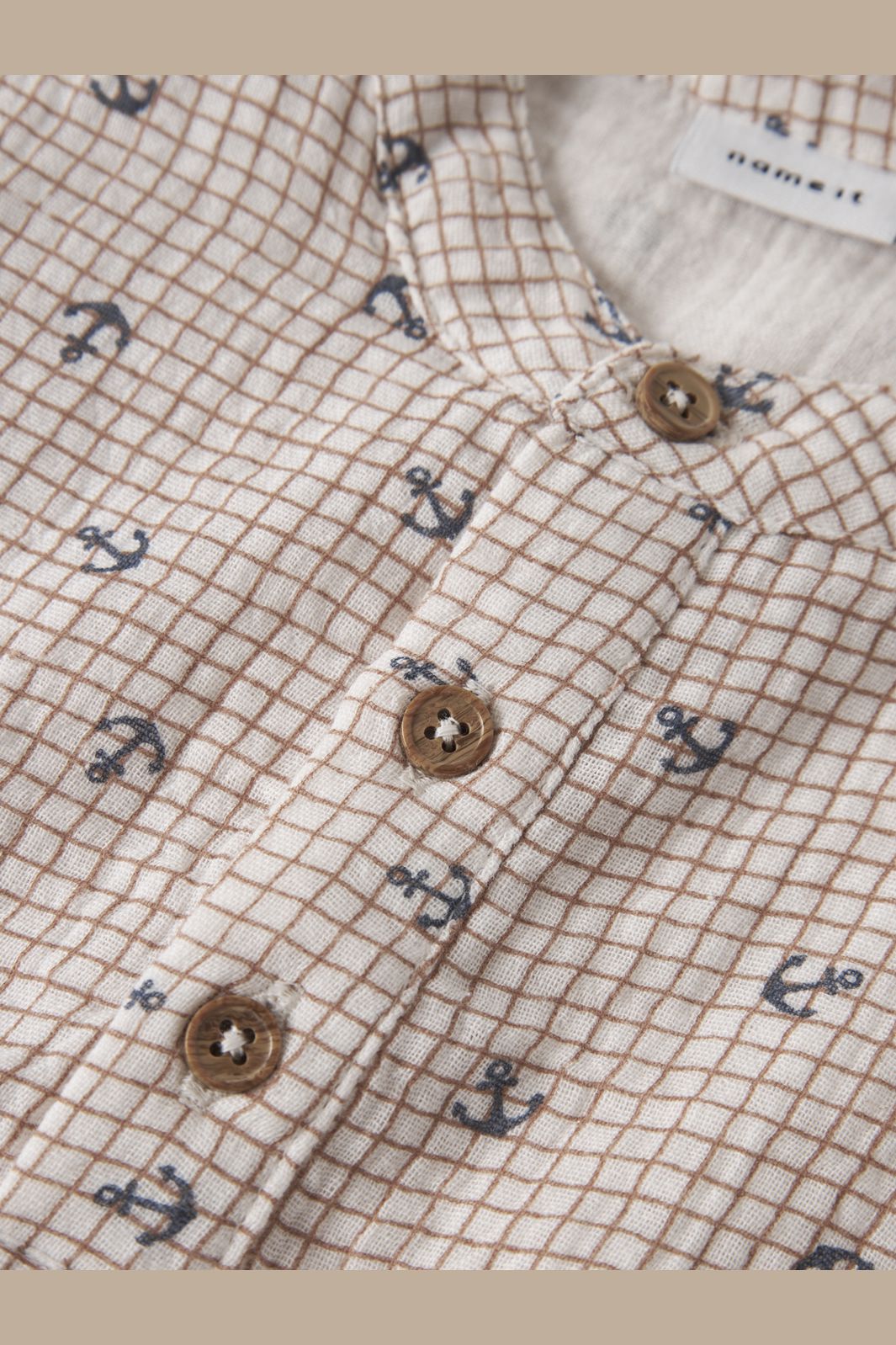 Kortemouwenshirt van Name It in een crème- en wittint. Het shirt heeft een geruit patroon met kleine ankerprints.