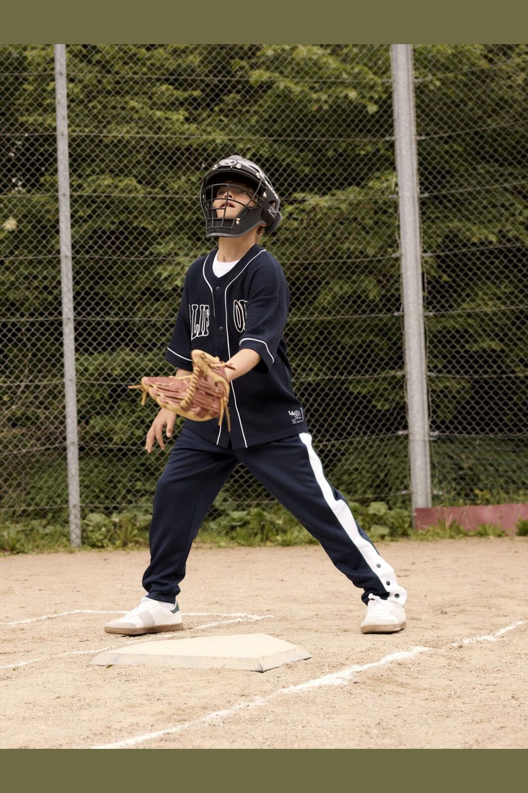 De geborduurde details en de witte piping langs de randen en mouwen creëren een sportieve contrast met de donkere stof.