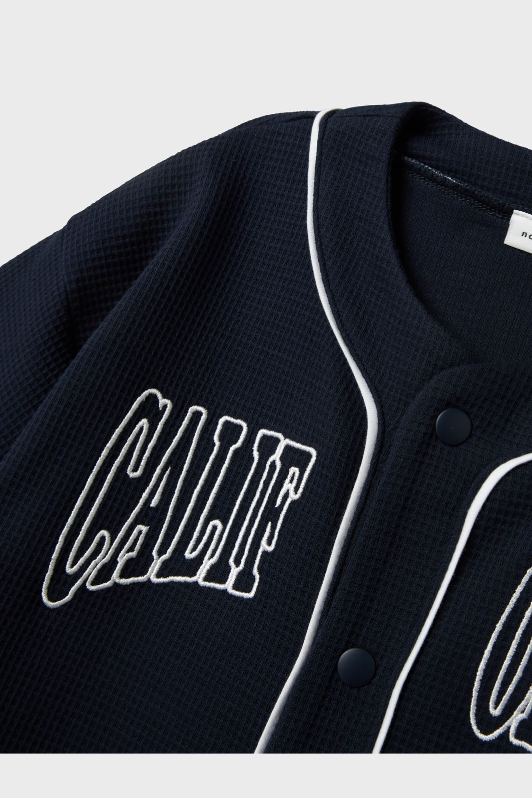 Marineblau cardigan van jacquard geweven stof met CALIFORNIA-tekst op de voorkant. Het korte model heeft witte piping langs de randen en knoopsluiting aan de voorkant.