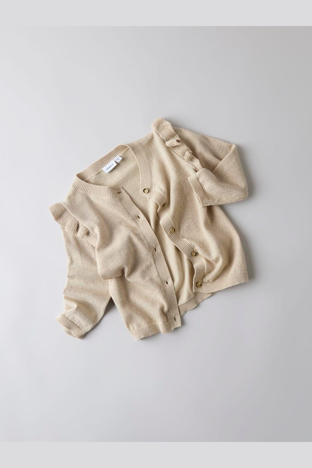 Een beige gebreid vest van Name It met een subtiel glanzend effect. Het vest heeft geplooide schouders en goudkleurige knopen.