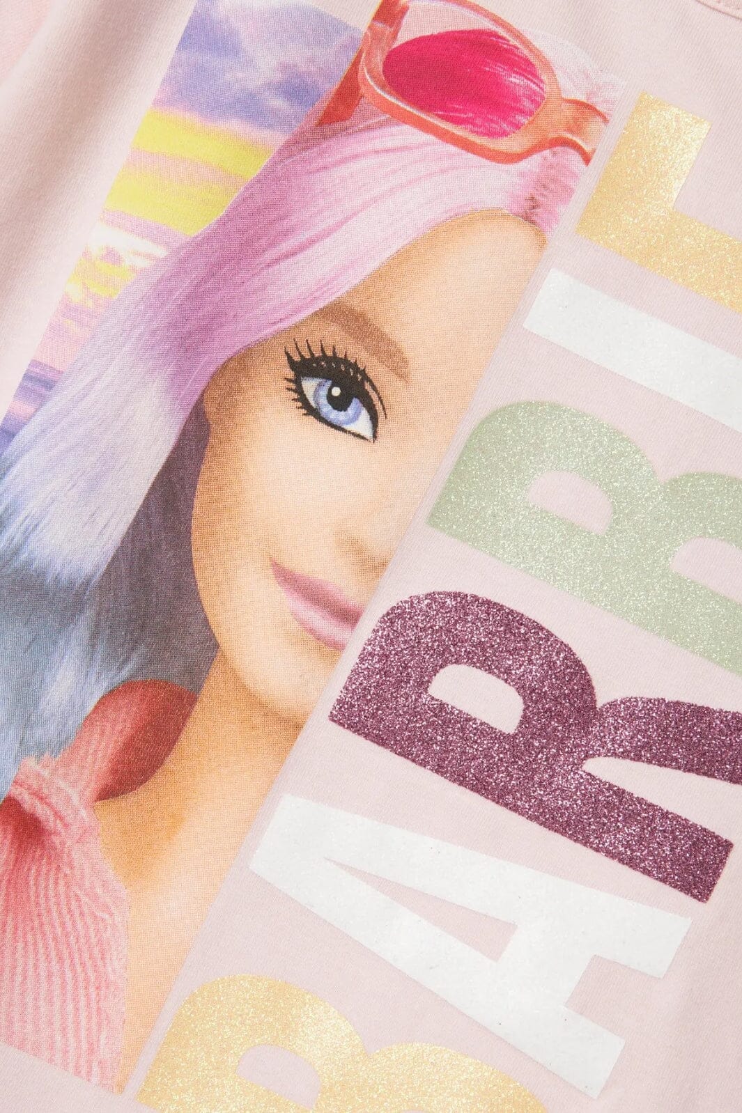 Roze t-shirt van Name It met grafische print. Het motief toont een pop met kleurrijk haar en een zonnebril, en de tekst heeft glinsterende details en rubberprint.