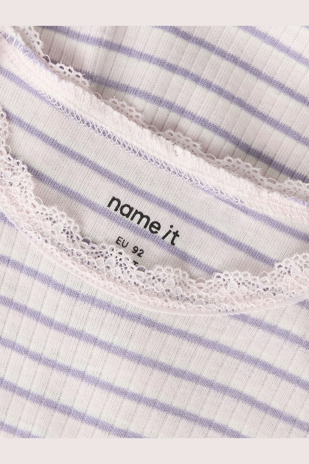Gestreepte jurk van Name It in roze en paarse tinten. De jurk is gemaakt van 100% biologische katoen en heeft kantdetails bij de hals en mouwen.