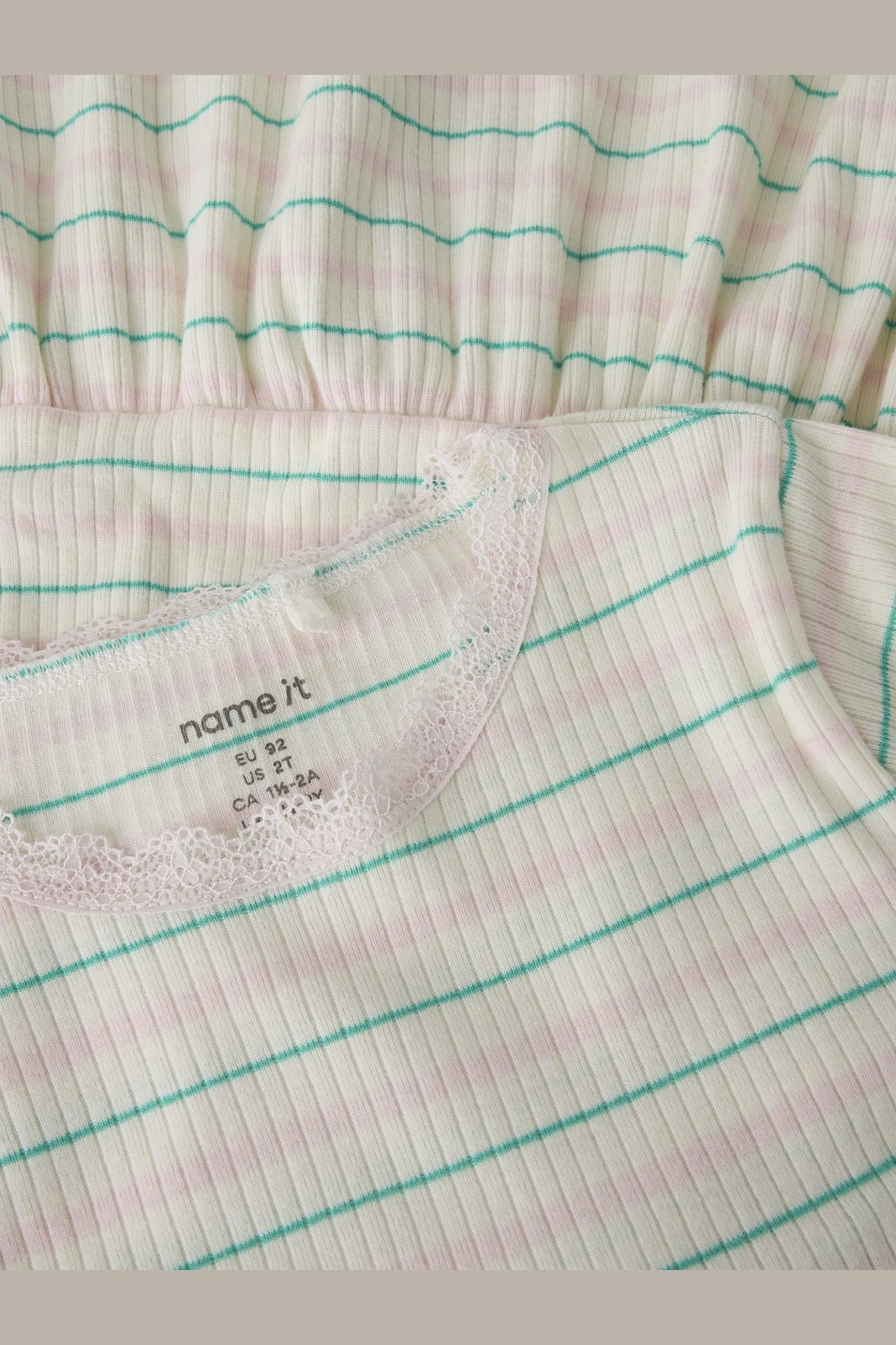 Gestreepte jurk van Name It, gemaakt van 100% biologische katoen in een lichte crèmekleurige tint. De jurk heeft kanten details bij de hals en mouwen.