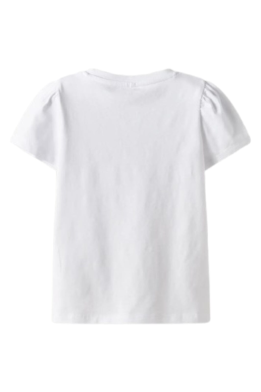 Witte t-shirt met paardenprint en bloemen van Name It. De t-shirt heeft korte puffmouwen en een ronde halslijn, wat zorgt voor een zachte silhouet.