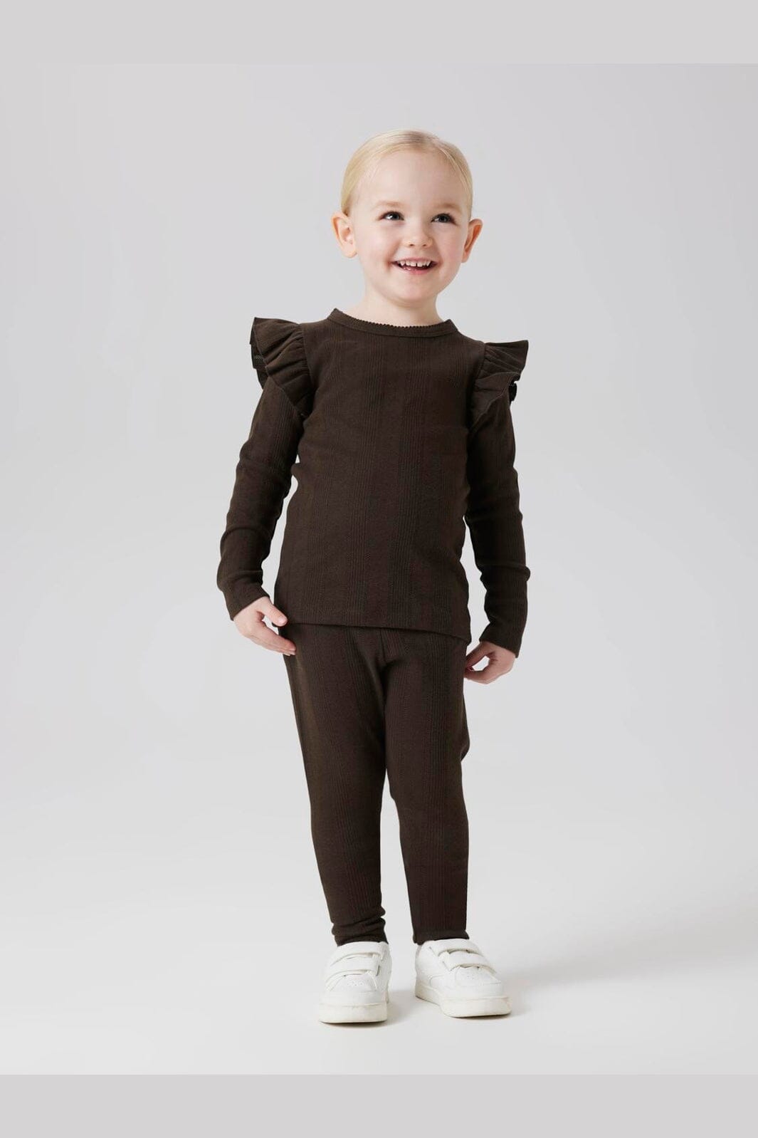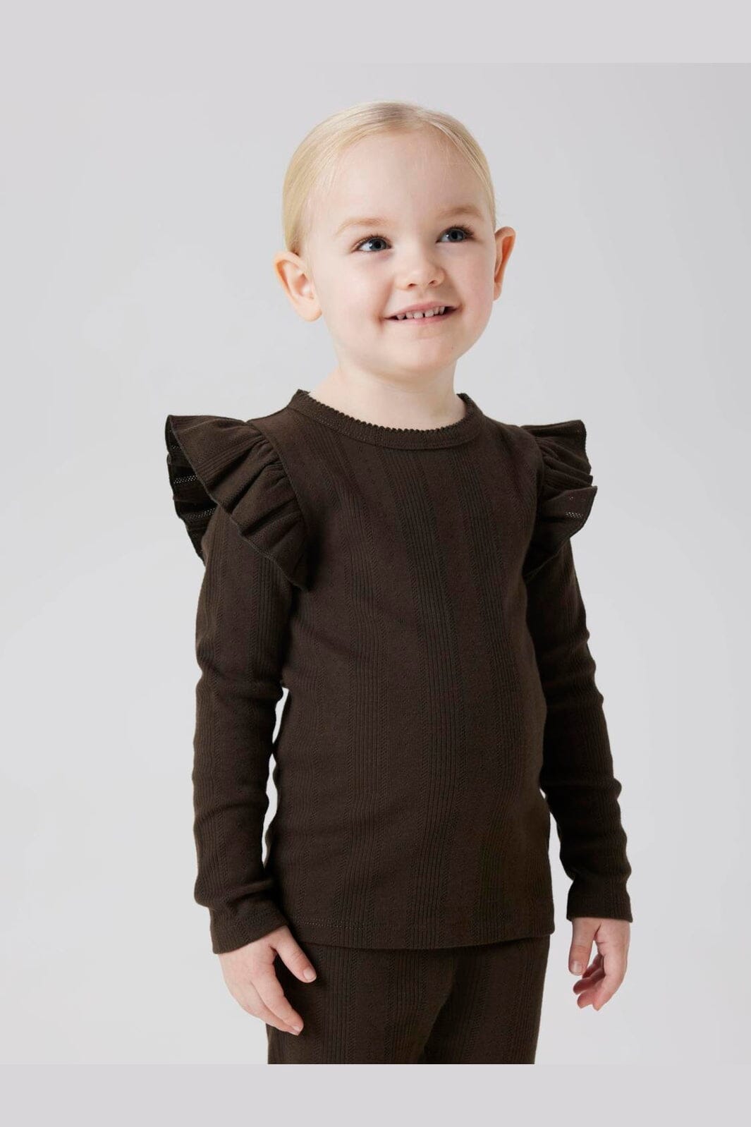 Langemige top van Name It in het bruin. De top heeft een geribde structuur met verticale patronen.