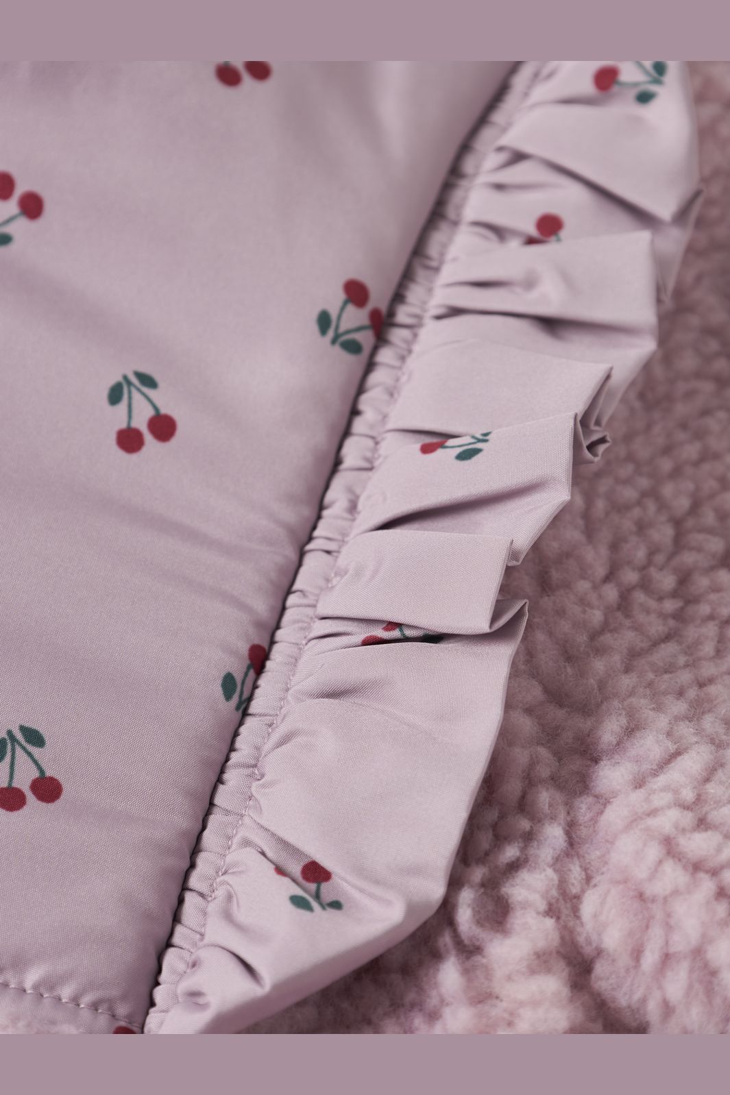 Teddyjas van Name It in een roze-paarse tint met een zacht, fluffy oppervlak. De jas heeft een hoge kraag en een kersenpatroon op het bovenste deel.