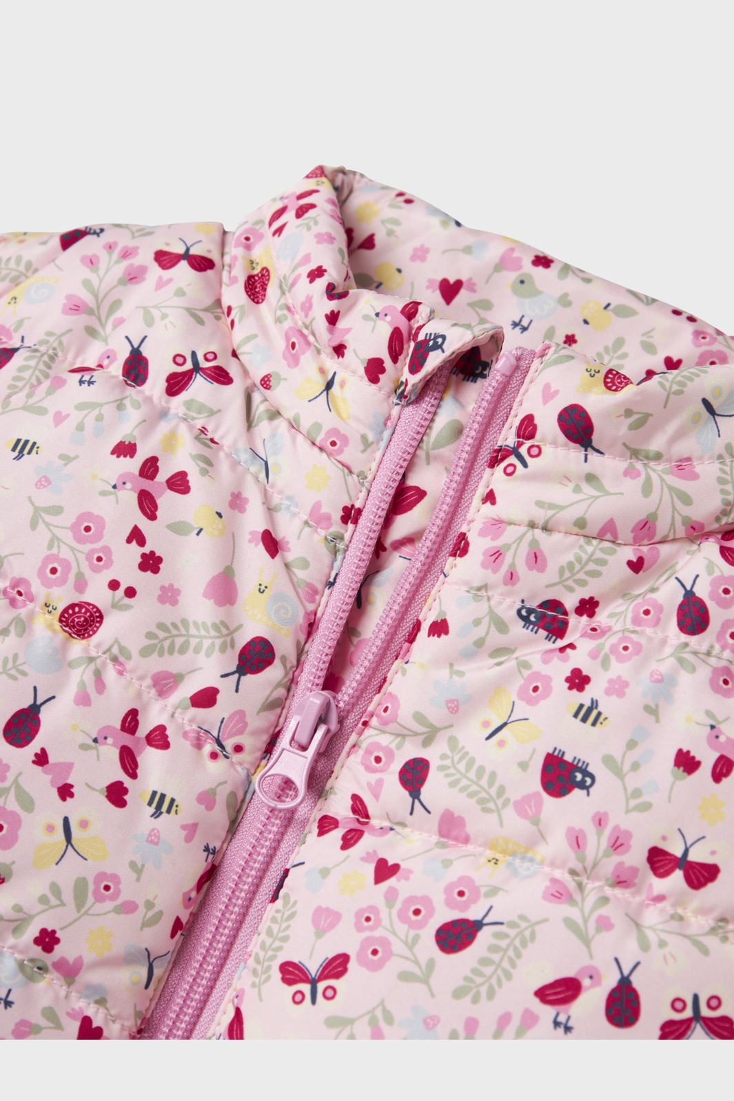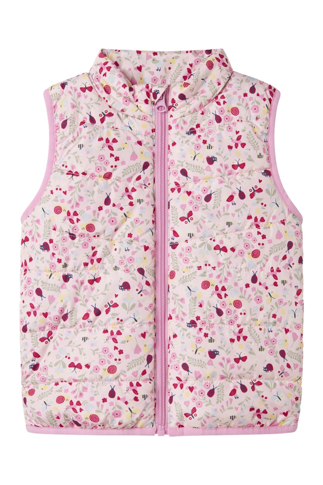 Een mouwloze vest met hoge kraag van Name It. Het roze vest heeft een patroon met bloemen en lieveheersbeestjes op een lichte achtergrond en sluit met een rits aan de voorkant.