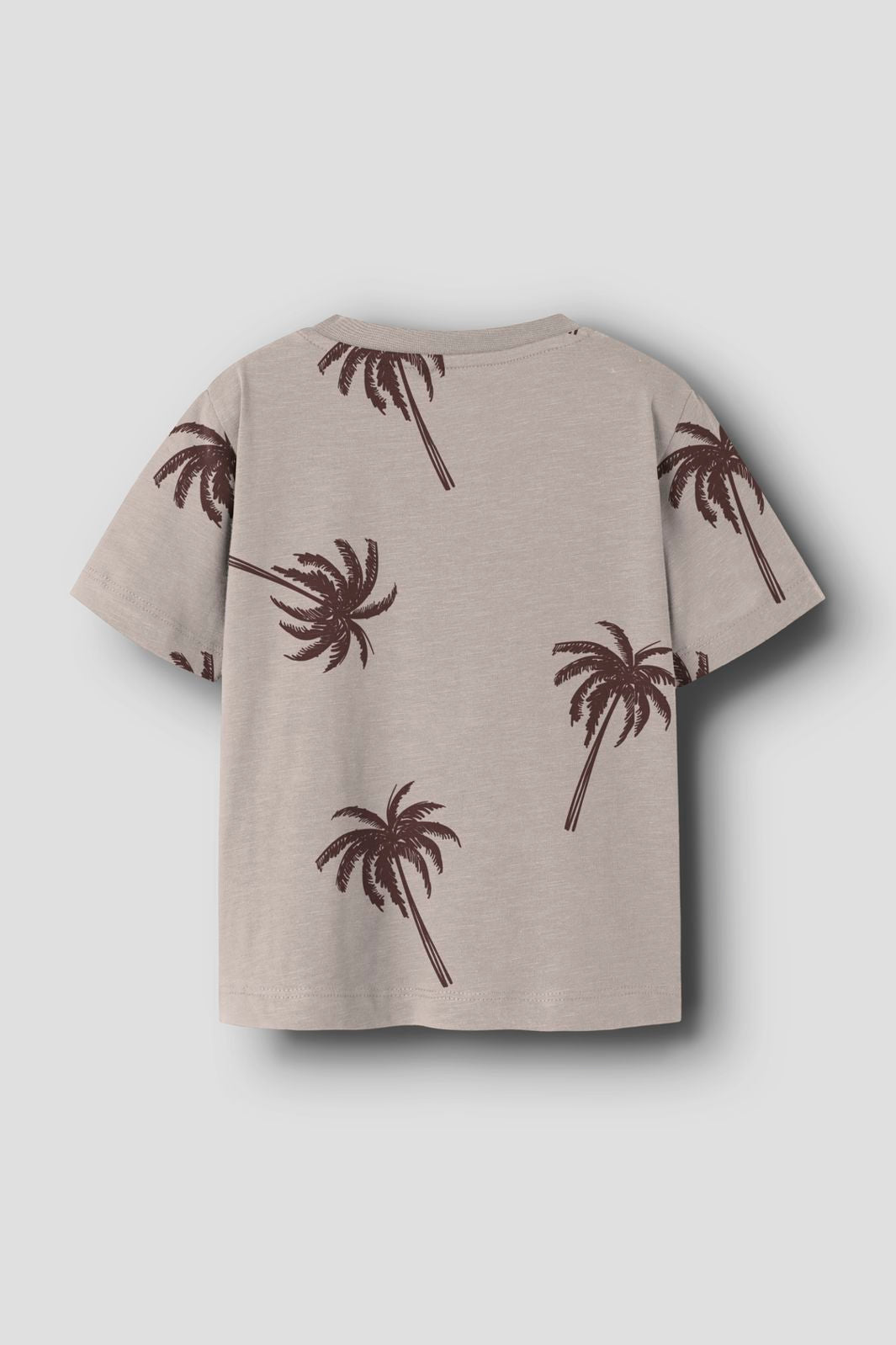 Grijze t-shirt van Name It met bruine palmbomen. De t-shirt heeft een ronde halslijn en korte mouwen.