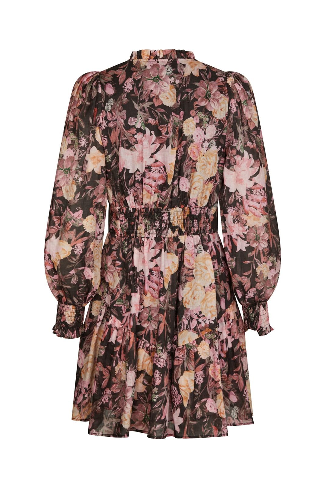 Zwarte jurk van Neo Noir met grote bloemen in roze, geel en groen. De jurk heeft een hoge hals, lange puffmouwen en knopen aan de voorkant. Een volant aan de onderkant geeft de jurk een vrouwelijke uitstraling.