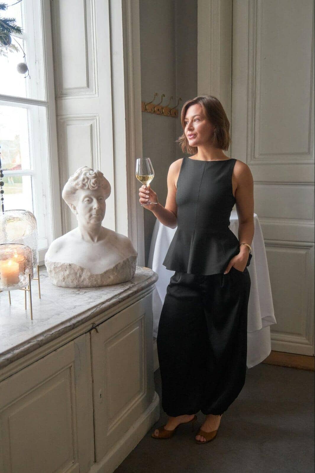 - Het model is 176 cm lang en draagt maat 36