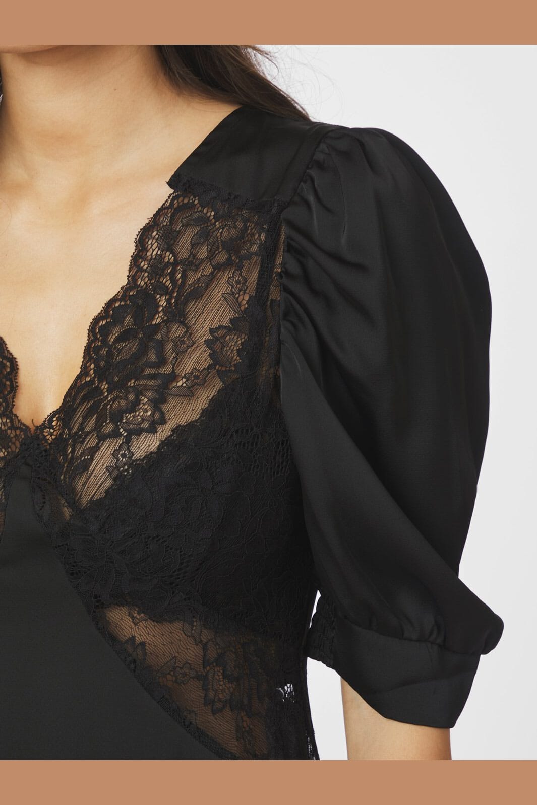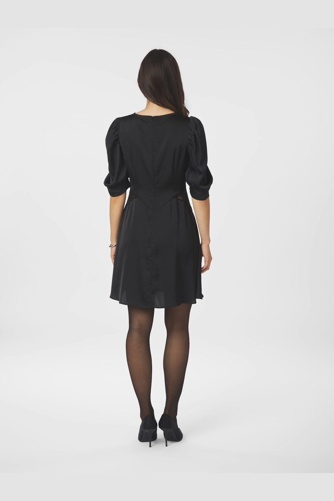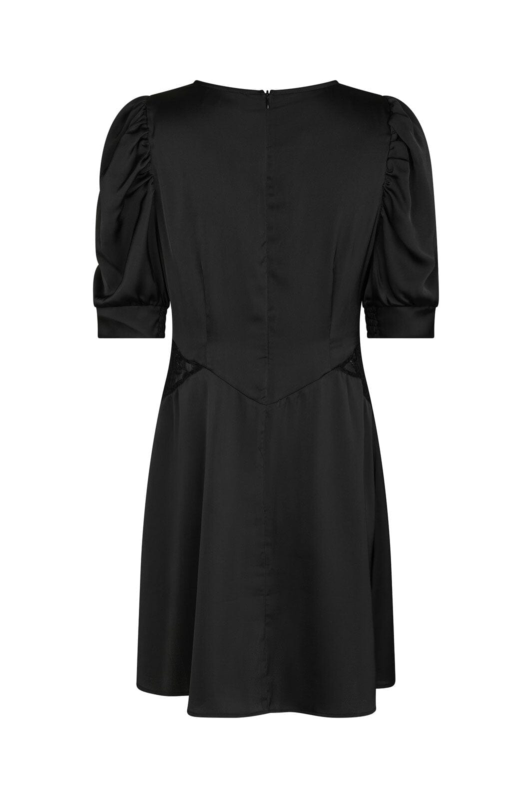 Zwarte jurk van Neo Noir in satijn met kantdetails aan de voorkant. Het heeft een v-hals en korte puffmouwen, evenals een rits aan de achterkant.