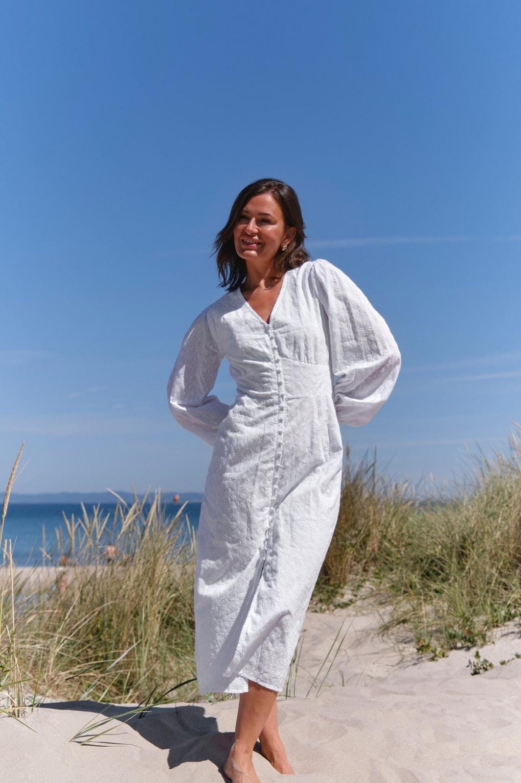 Witte jurk van Neo Noir in broderie anglaise kwaliteit. De jurk heeft bloemenborduursel over de hele stof, V-hals en knopen langs de voorkant. De lange mouwen hebben een pof bij de schouders.