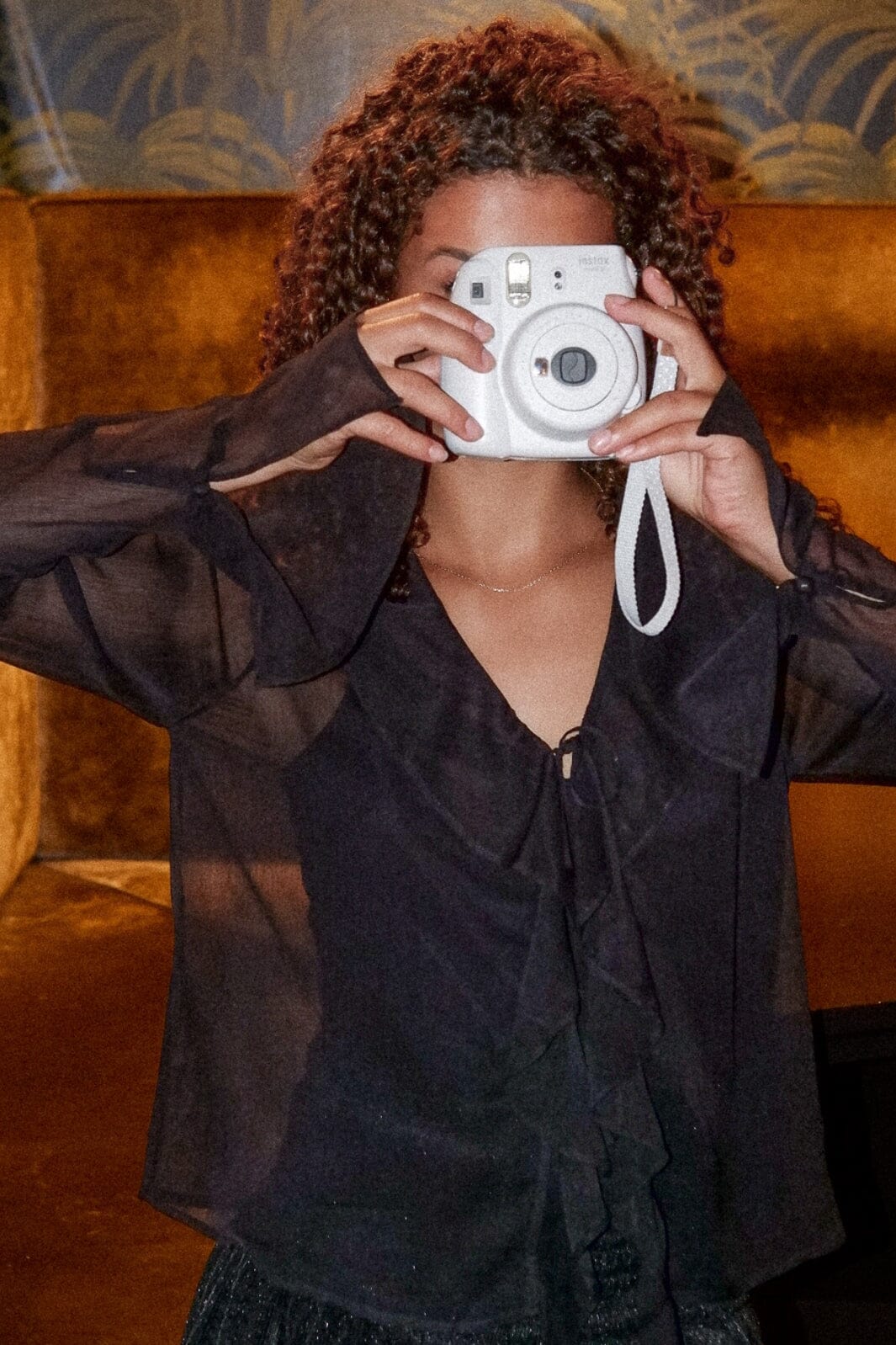 Zwarte blouse van Neo Noir met V-hals en ruffles. De blouse heeft een gerimpeld ontwerp aan de voorkant en een strikband. De lange mouwen hebben ruffle-randen bij de polsen.