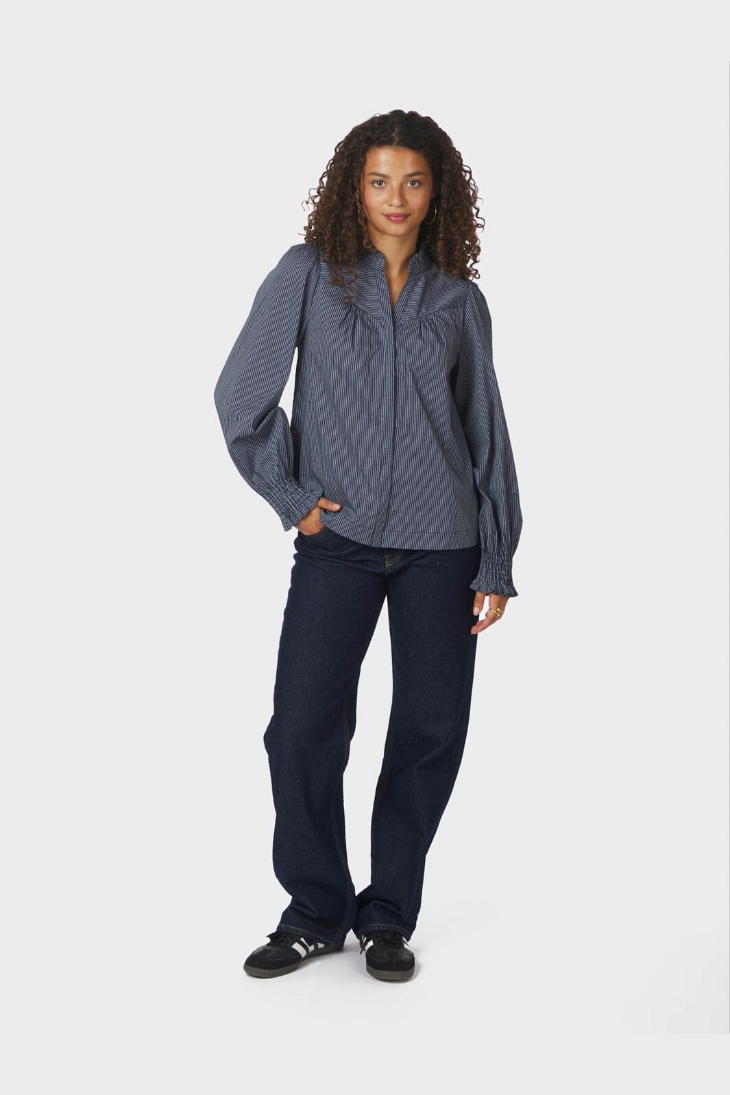 Donkerblau gestreepte blouse van Neo Noir met hoge hals en lange mouwen. De blouse heeft smockmanchetten en een kleine volantschouder en knopen aan de voorkant voor sluiting.