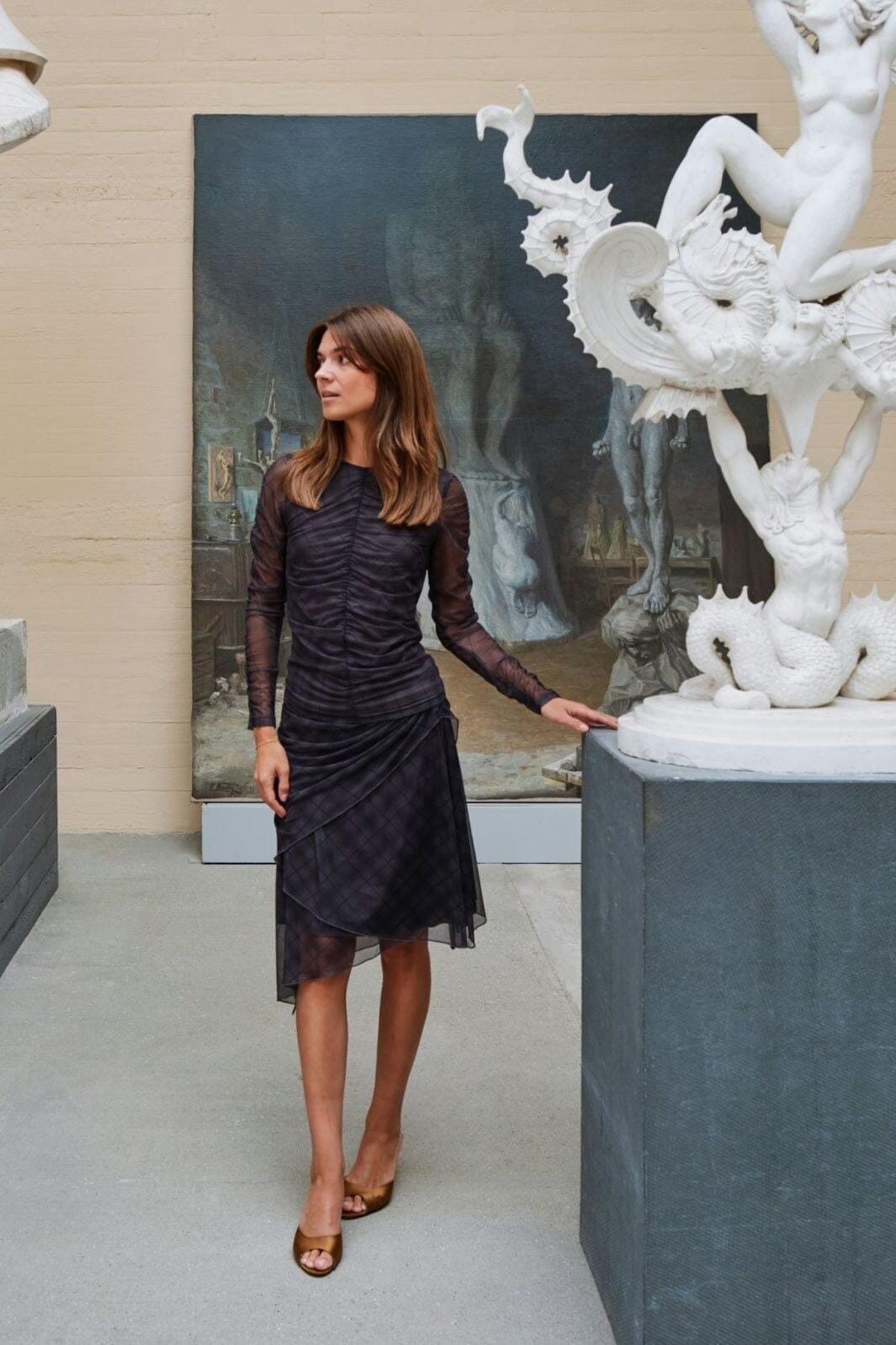 Donkergrijze meshblouse van Neo Noir met geruit patroon. De blouse heeft doorzichtige lange mouwen en gerimpelde details op zowel de mouwen als het lichaam, wat diepte in het ontwerp creëert.