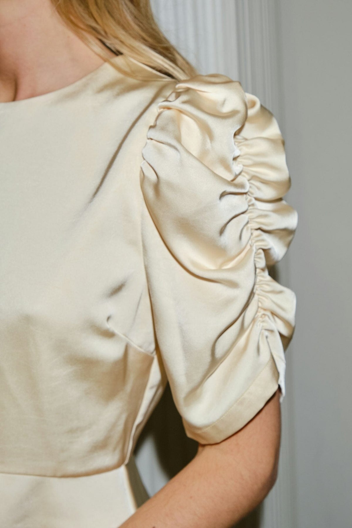 Lichtgele satijnen blouse van Neo Noir met pofmouwen en een subtiel peplumeffect in de taille. De blouse is geschikt voor formele diners en feestelijke gelegenheden.