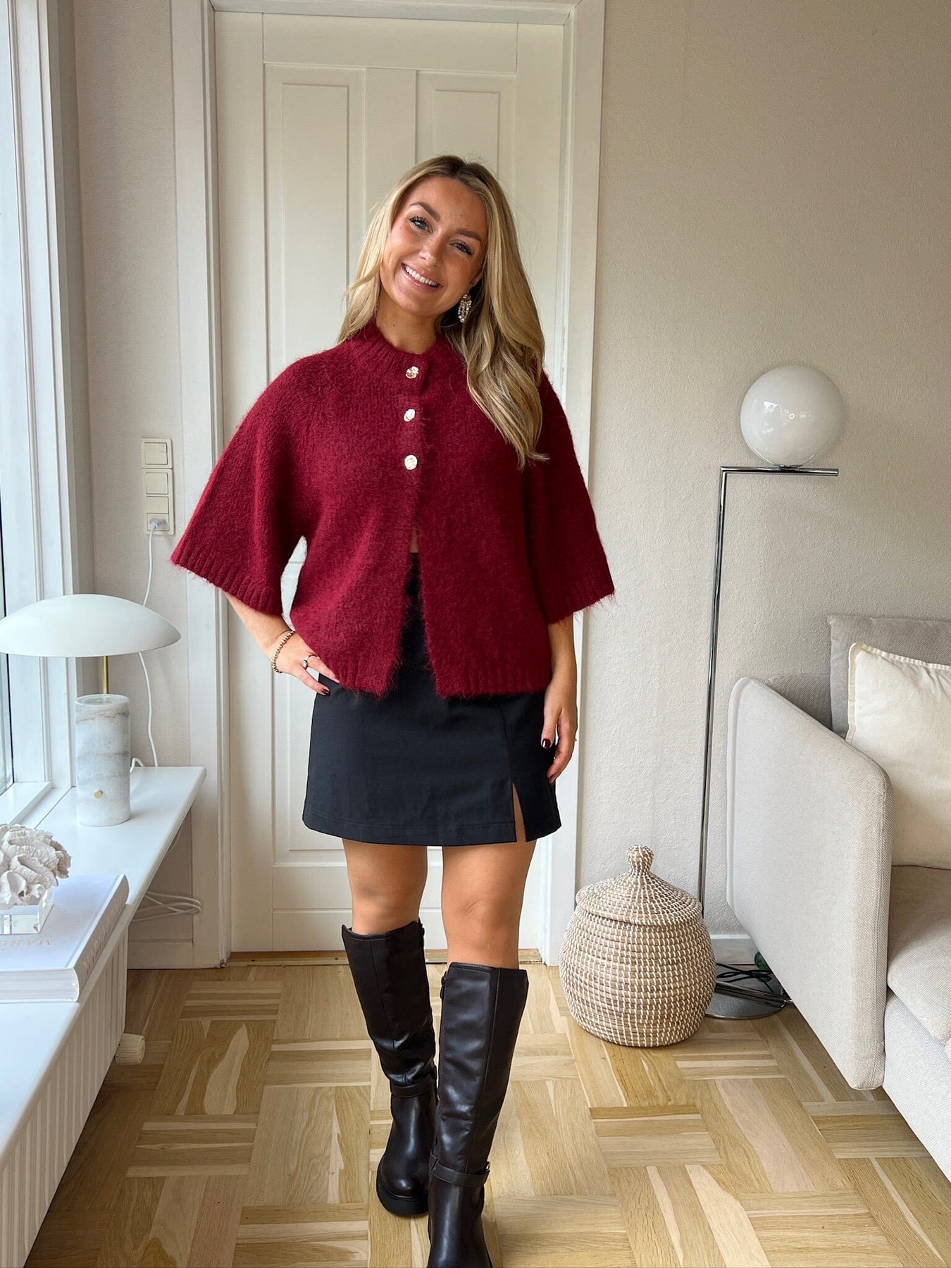 Donkerrode cardigan van Neo Noir met fluffy gebreide textuur. De losse pasvorm met korte mouwen en hoge hals biedt veel bewegingsvrijheid voor zowel dagelijks gebruik als feesten.