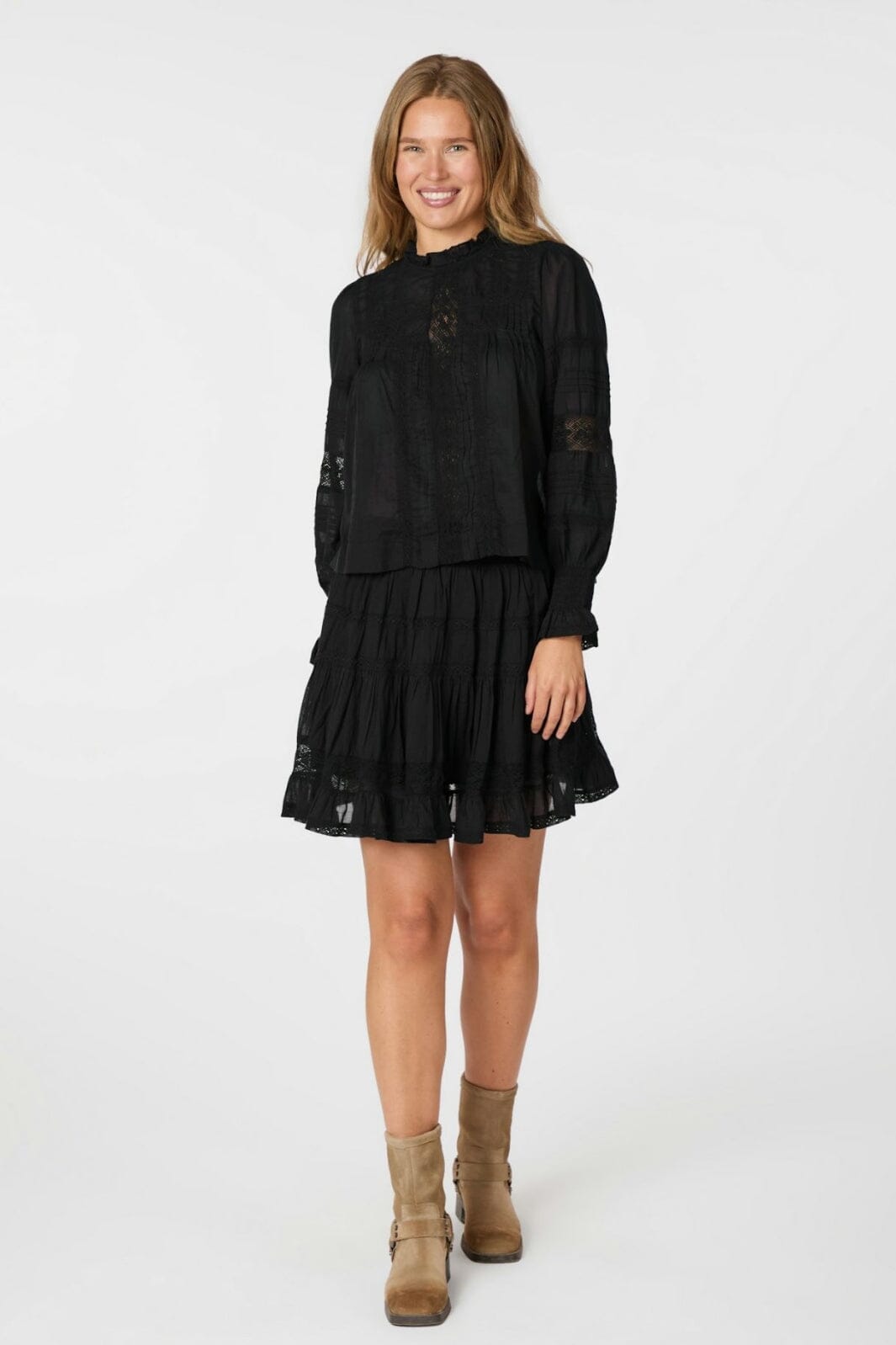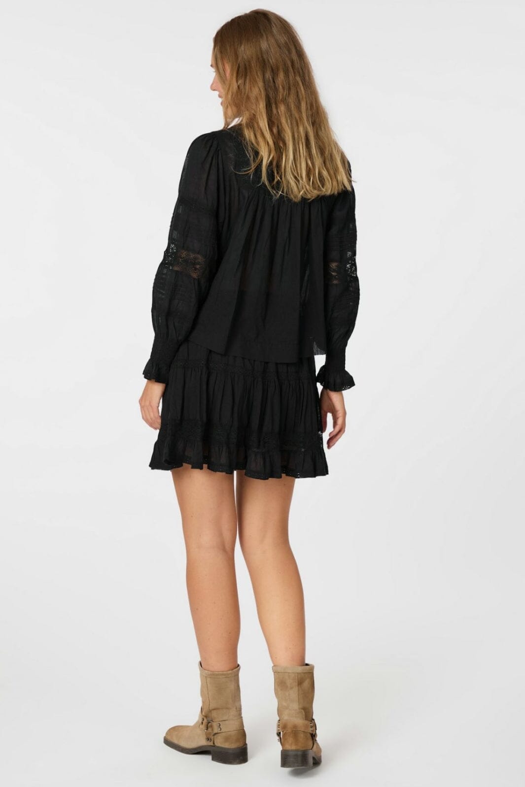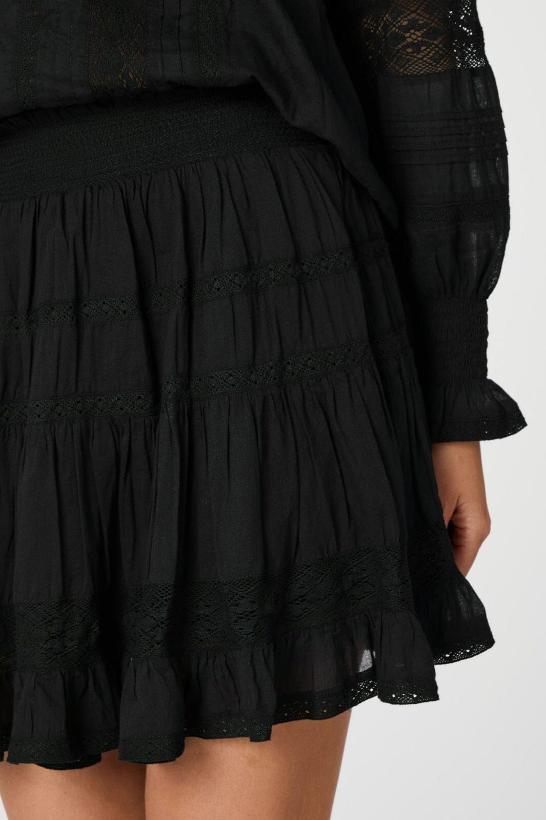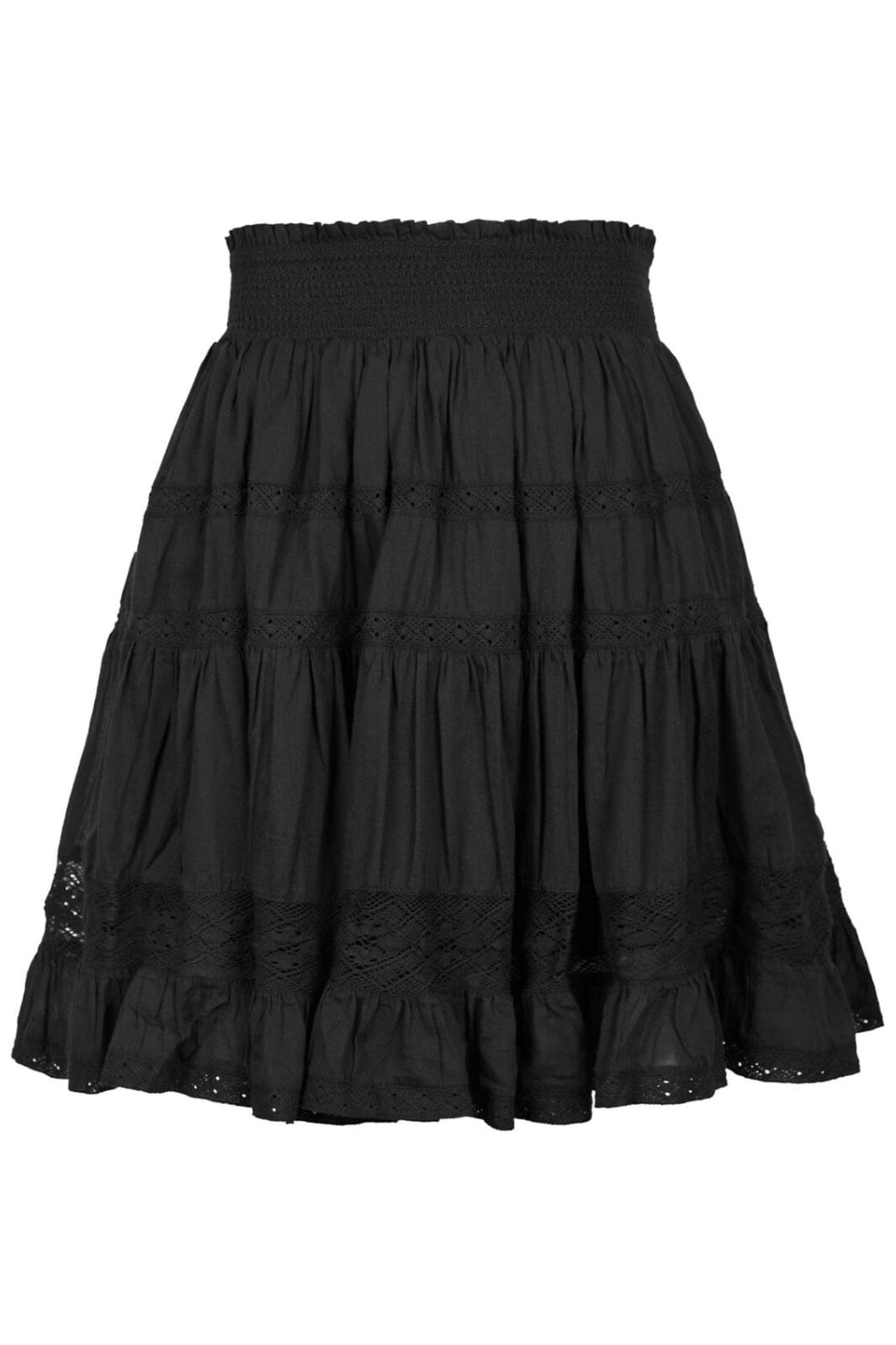 Zwarte voile rok met kant en ruches. De hoge taille met smock zorgt voor een goede pasvorm, en de katoenvoile creëert een lichte en luchtige look.