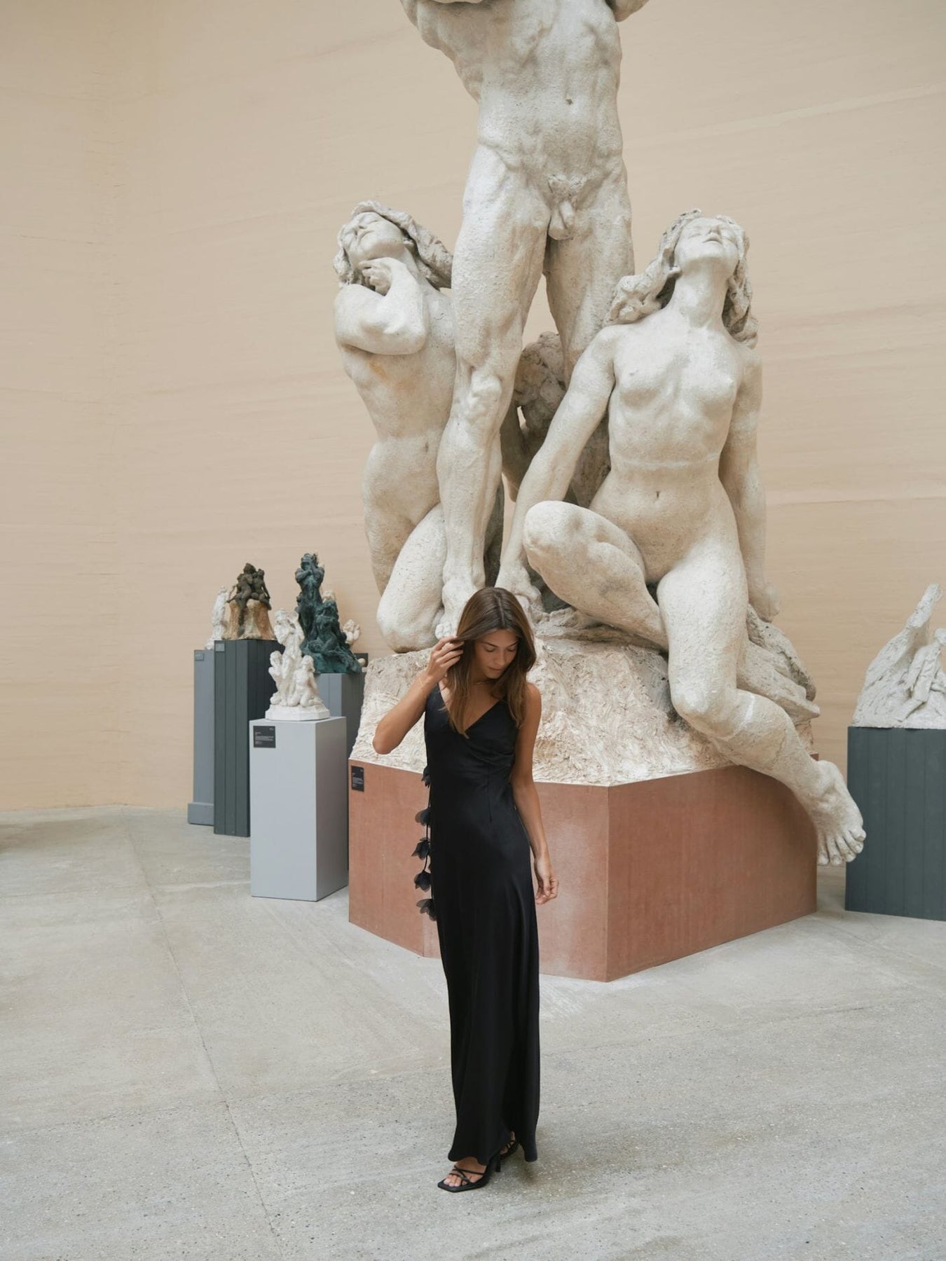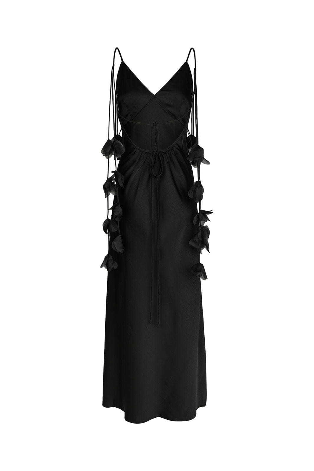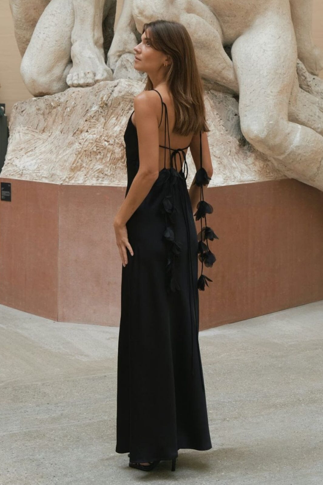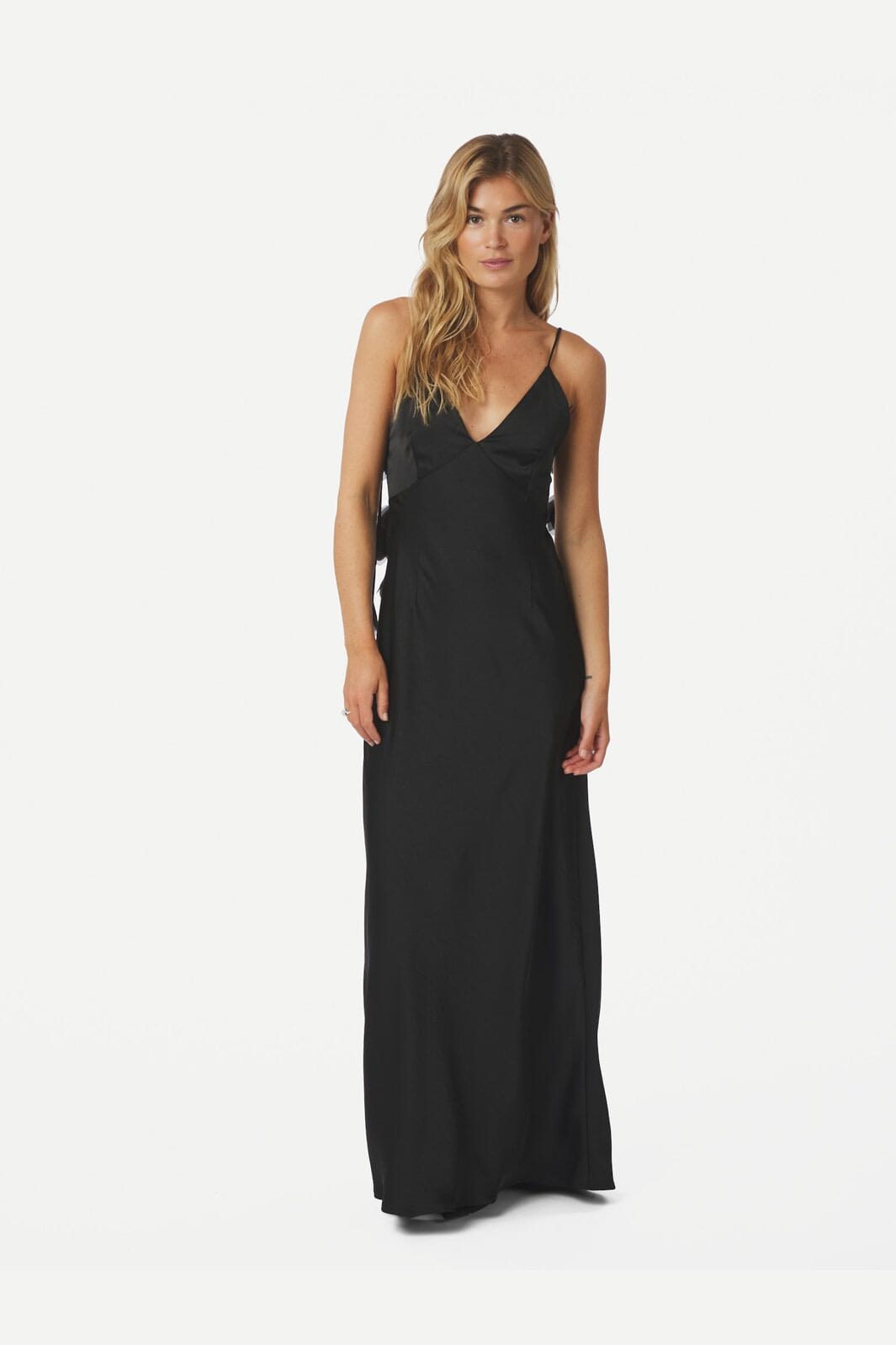 Zwarte vloerlange jurk van Neo Noir in zware crepe-satijn. De jurk heeft een V-hals, spaghettibandjes met bloemdecoraties en een strik op de rug.