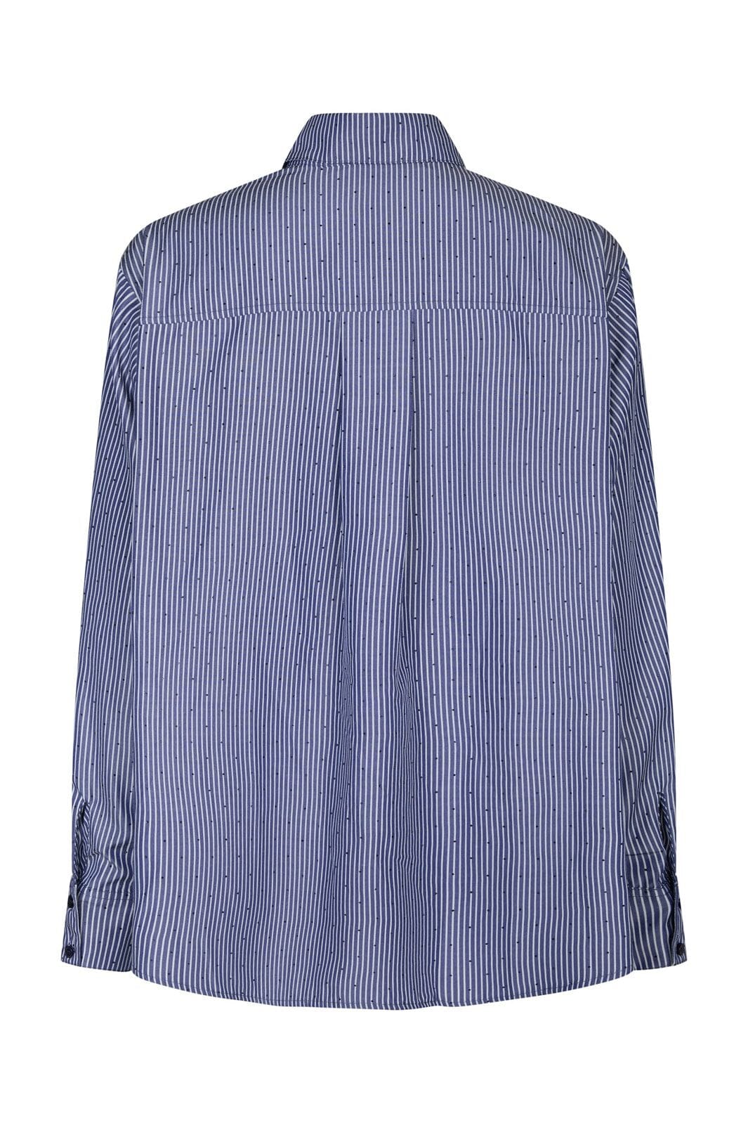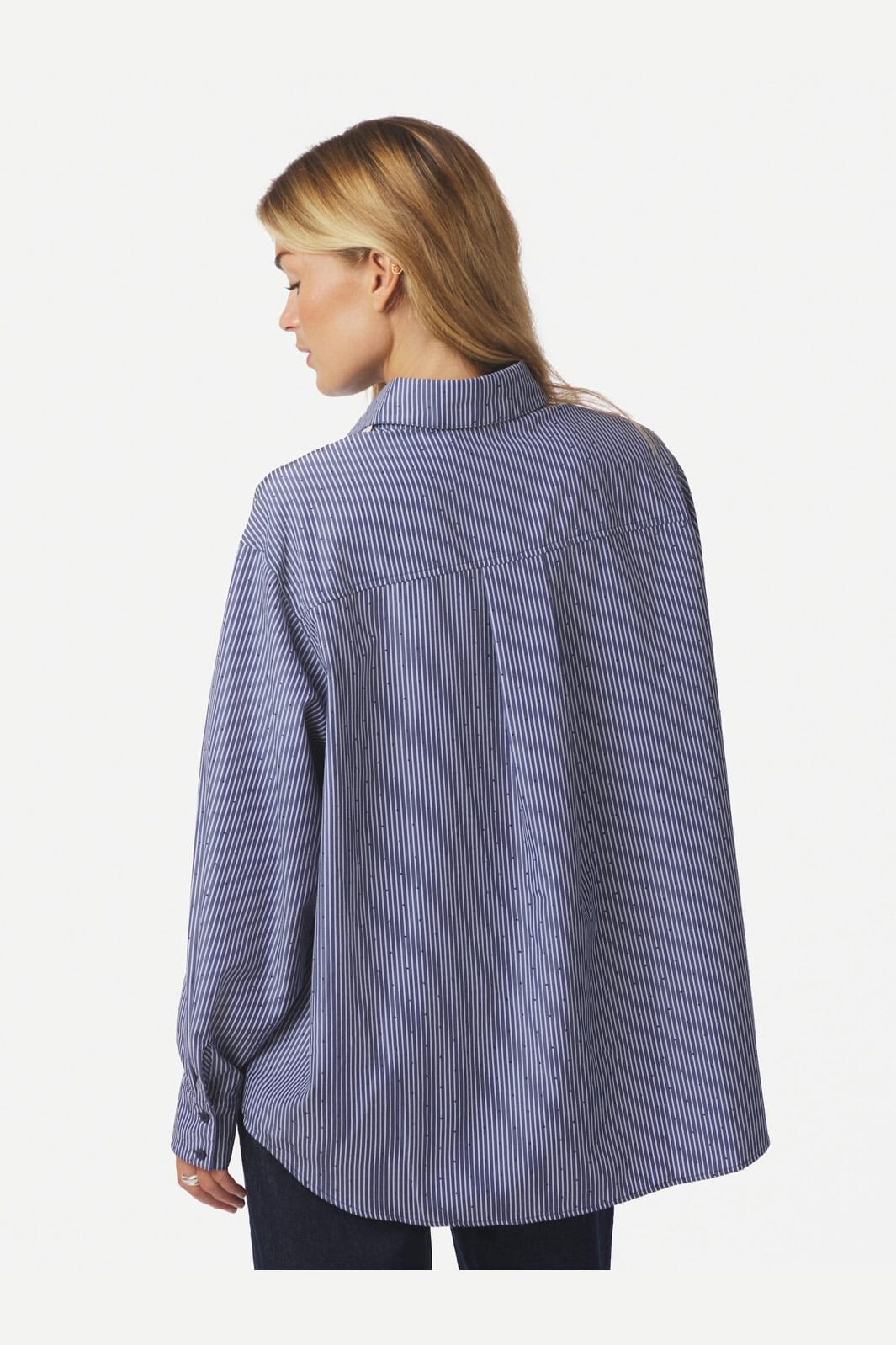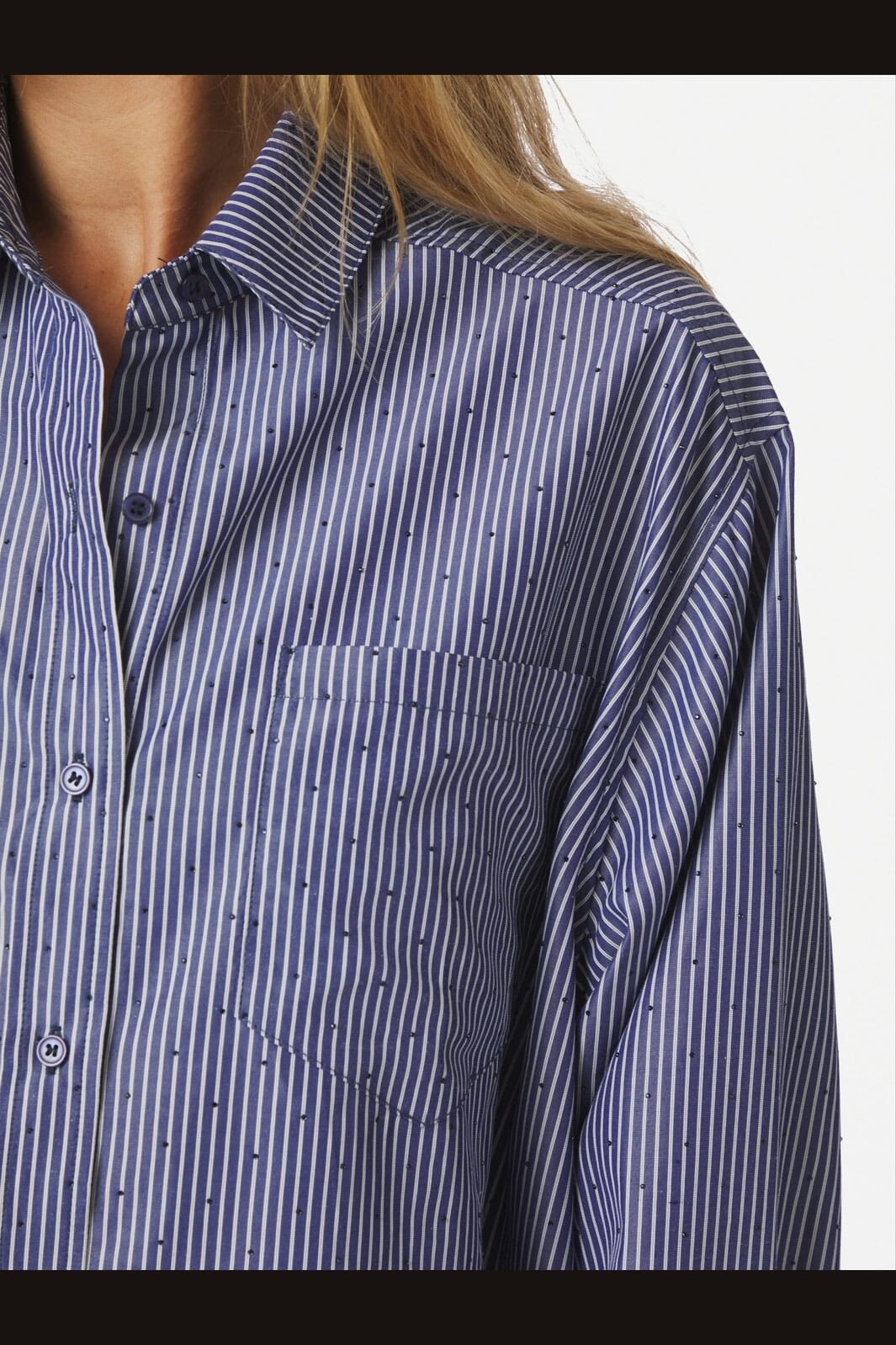 Donkerblau shirt van Neo Noir met strepen en glitterstenen. Het shirt heeft een oversized pasvorm en combineert klassieke strepen met kleine stippen en glitterdetails.