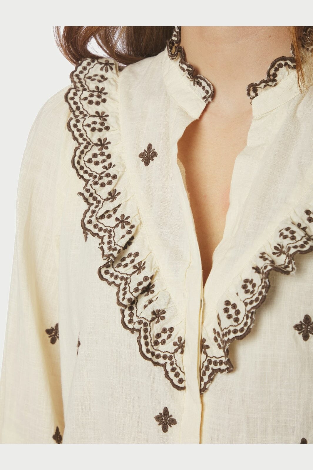 Blouse van Neo Noir in lichtgeel katoen met bruine geborduurde bloemen en kanten band langs de V-hals en manchetten.