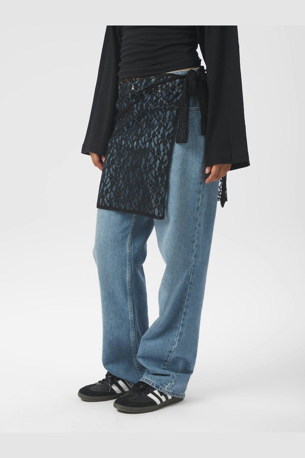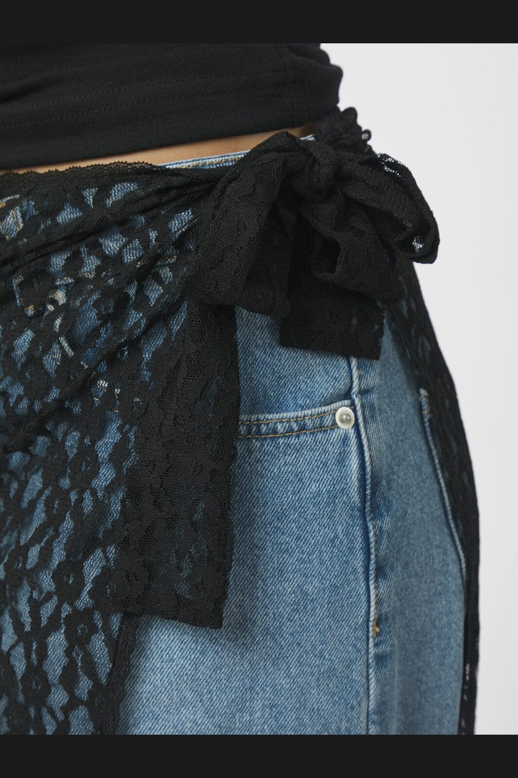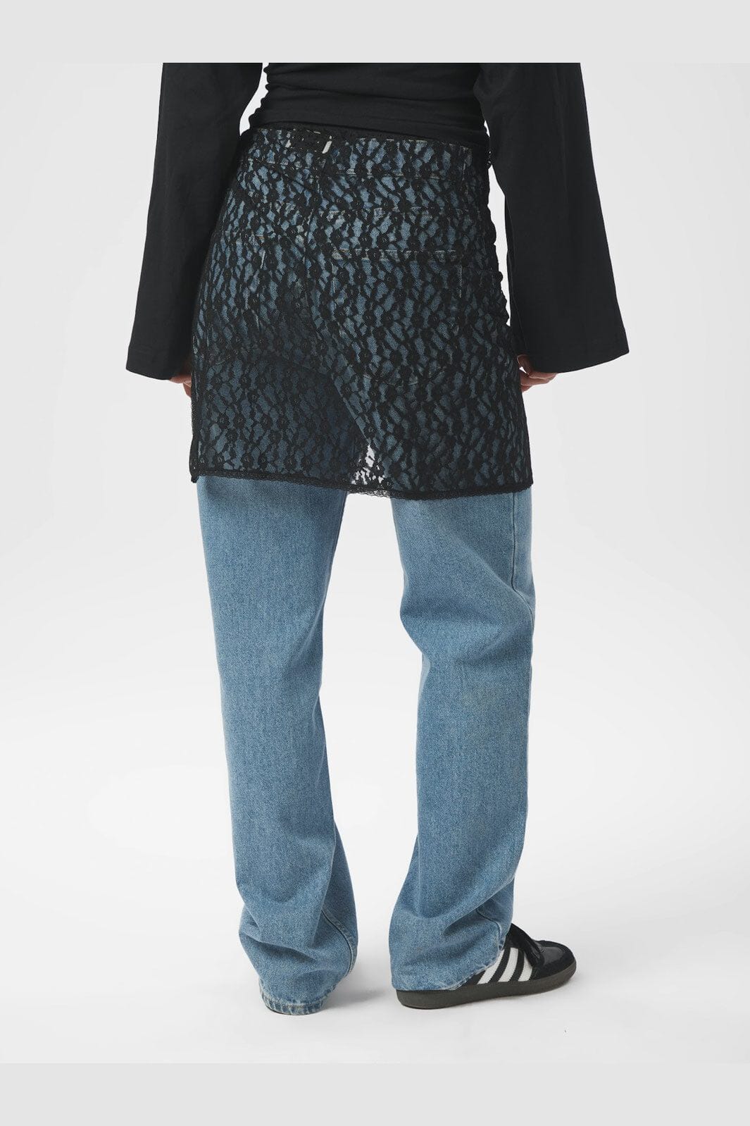Zwarte wikkelrok van Neo Noir van kantmateriaal. De rok heeft een striksluiting aan de zijkant en is ontworpen om over broeken of jeans te worden gedragen voor een extra laag.