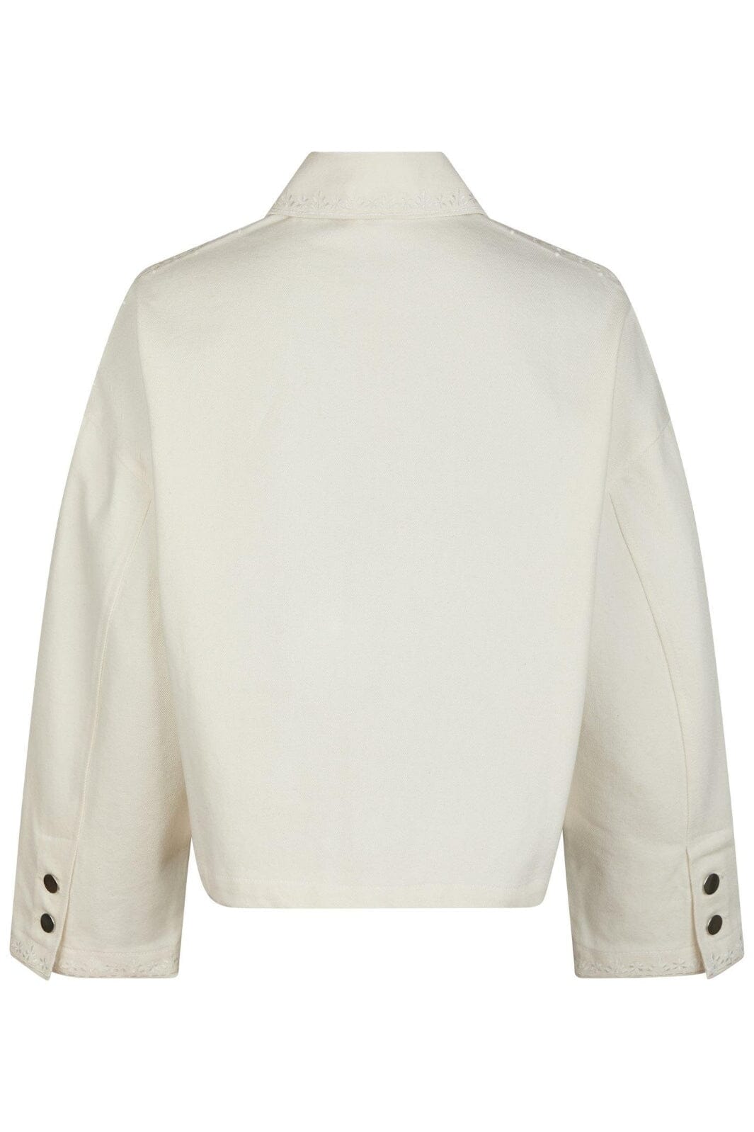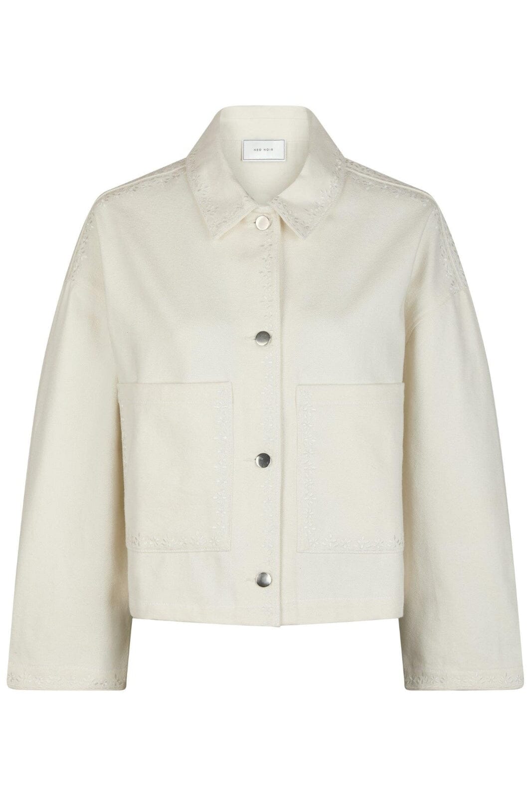Witte denimjack van Neo Noir met korte, boxy pasvorm. De jas heeft geborduurde randen en praktische zakken aan de voorkant. De knoopsluiting en de overhemdkraag geven de jas een klassieke uitstraling.