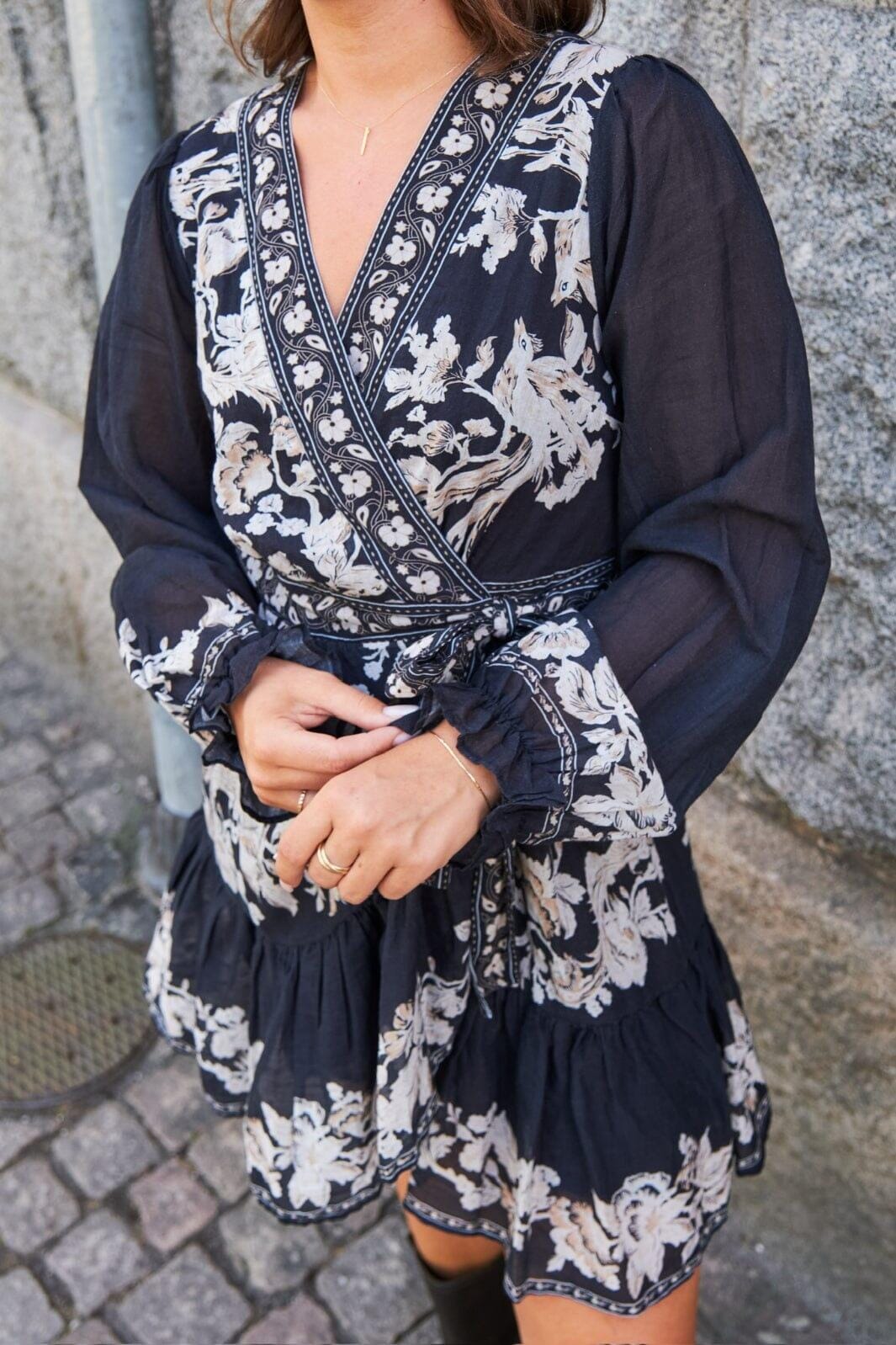 Donkerblau wikkeljurk van Neo Noir met witte bloemenprint. De jurk heeft een V-hals, lange puffmouwen en ruches. Het strikband in de taille biedt de mogelijkheid om de pasvorm aan te passen.