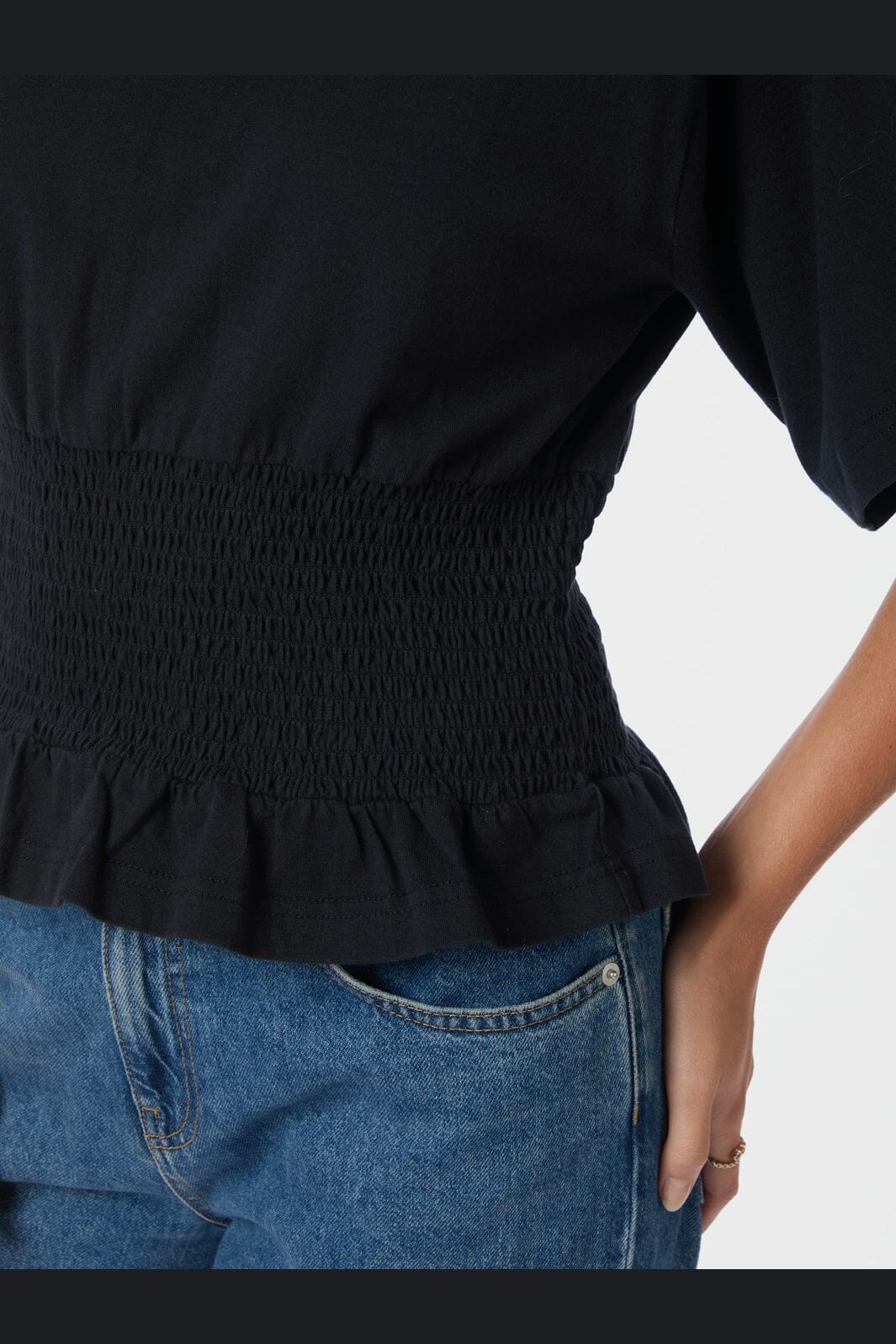 Donkerblau T-shirt van Neo Noir met boxy pasvorm en smock-detail in de taille. Het is gemaakt van zachte katoenkwaliteit en heeft korte mouwen en een ronde halsuitsnijding.