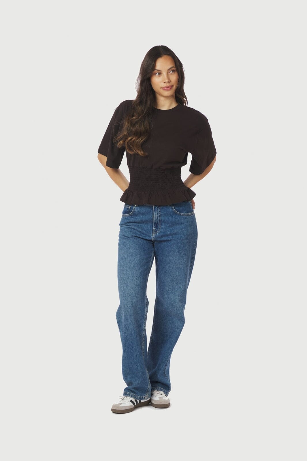 Donkerbruin t-shirt van Neo Noir met boxy pasvorm en smock-detail in de taille. De ronde halslijn en de korte mouwen geven het t-shirt een schone en eenvoudige uitstraling.