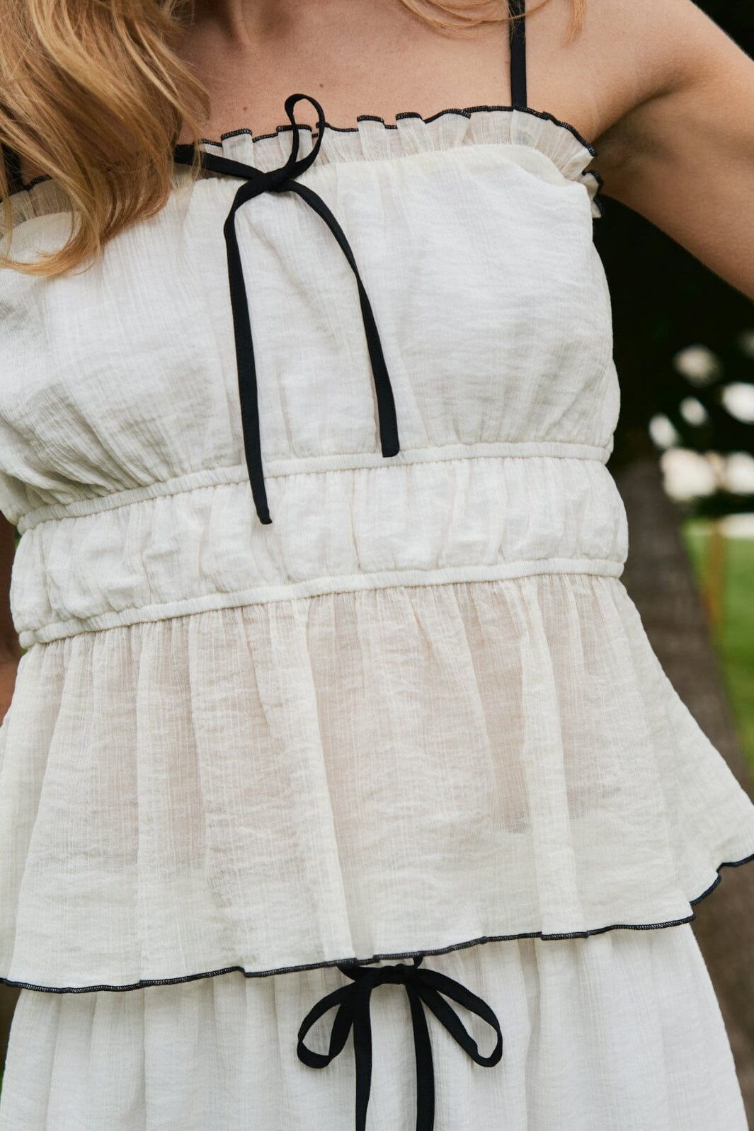 Crème-kleurige crepe-top van Neo Noir met een aansluitende pasvorm. De top heeft een contrasterende strik aan de voorkant en verstelbare bandjes die de pasvorm aanpassen.