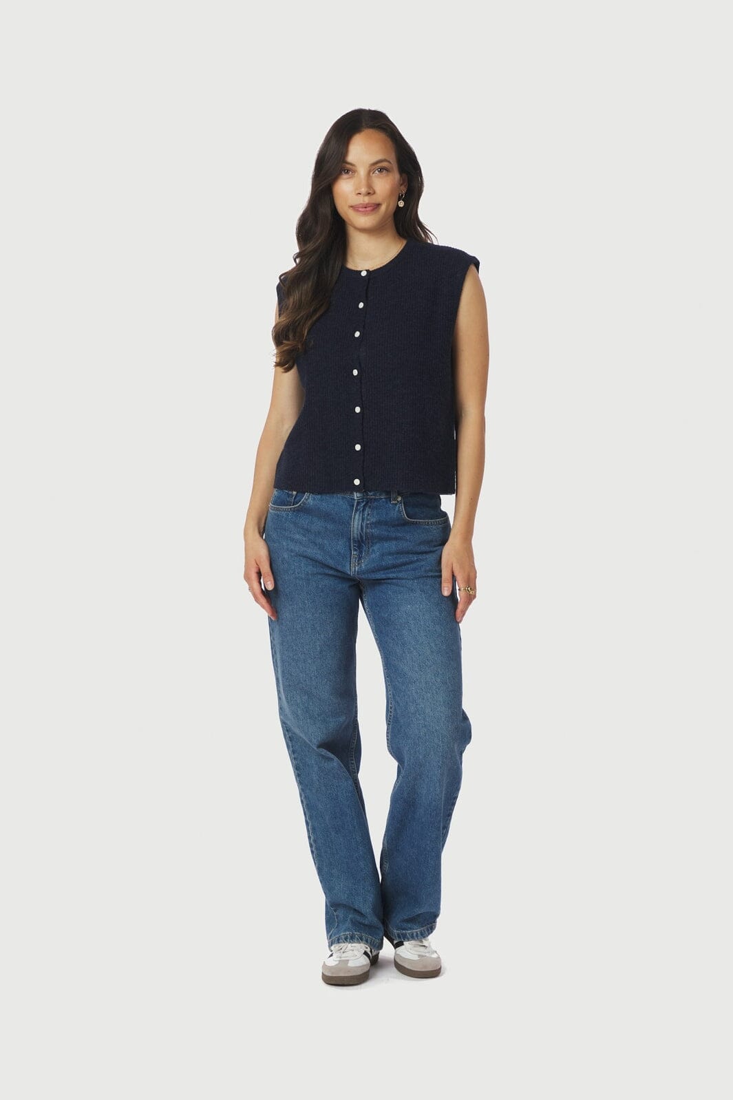 Gebreide vest van Neo Noir in donkerblauw. Het heeft een losse pasvorm met ronde halslijn en parelknoopsluiting aan de voorkant.
