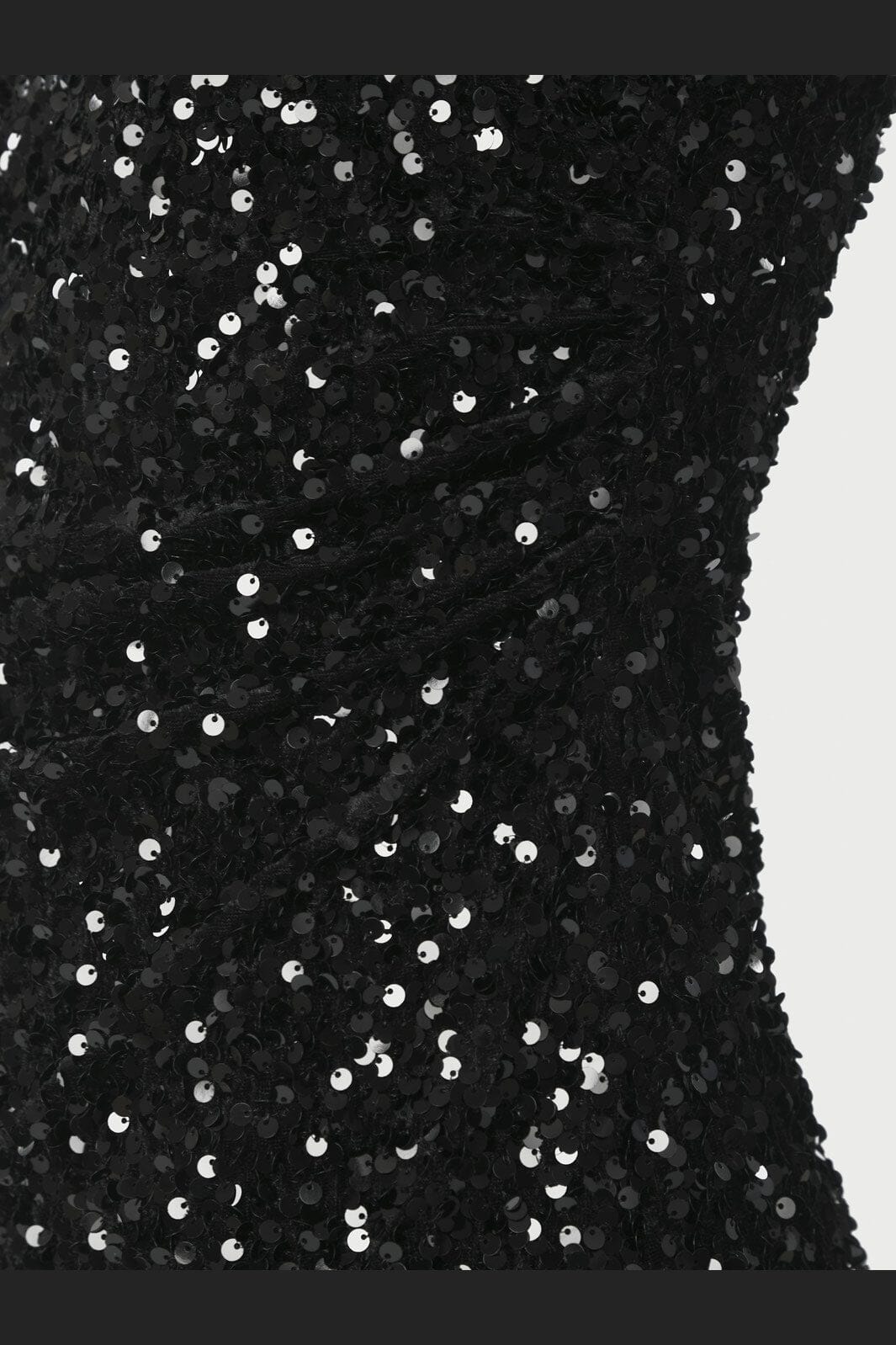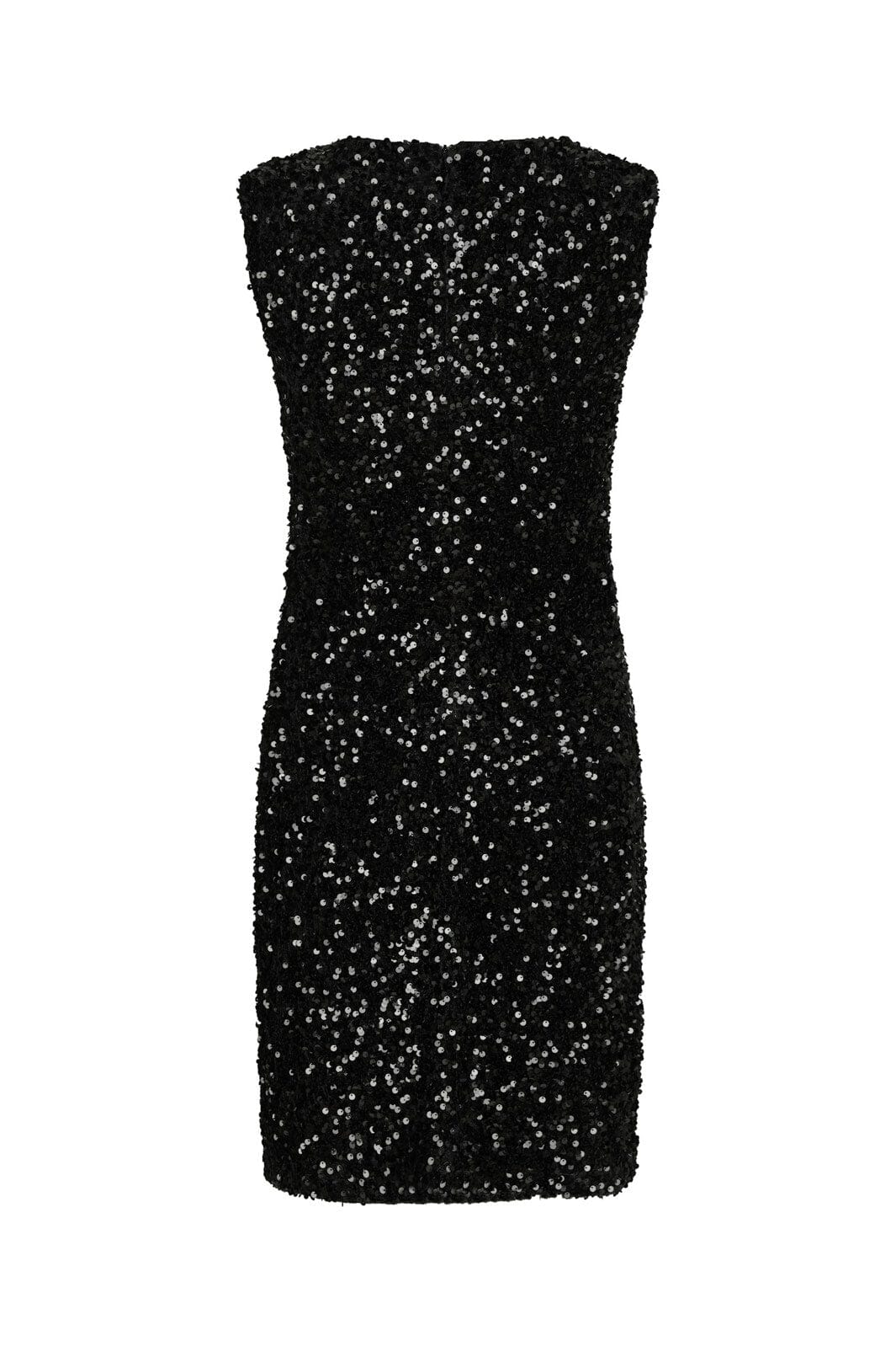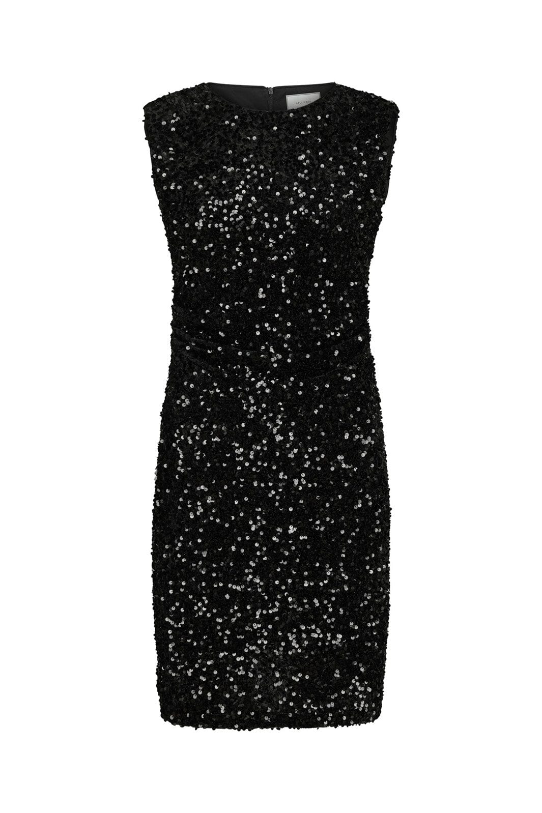 Zwarte veloursjurk van Neo Noir met pailletten over de hele jurk. De aansluitende jurk heeft een ronde hals en is mouwloos. De rits aan de achterkant maakt het gemakkelijk om uit te trekken.