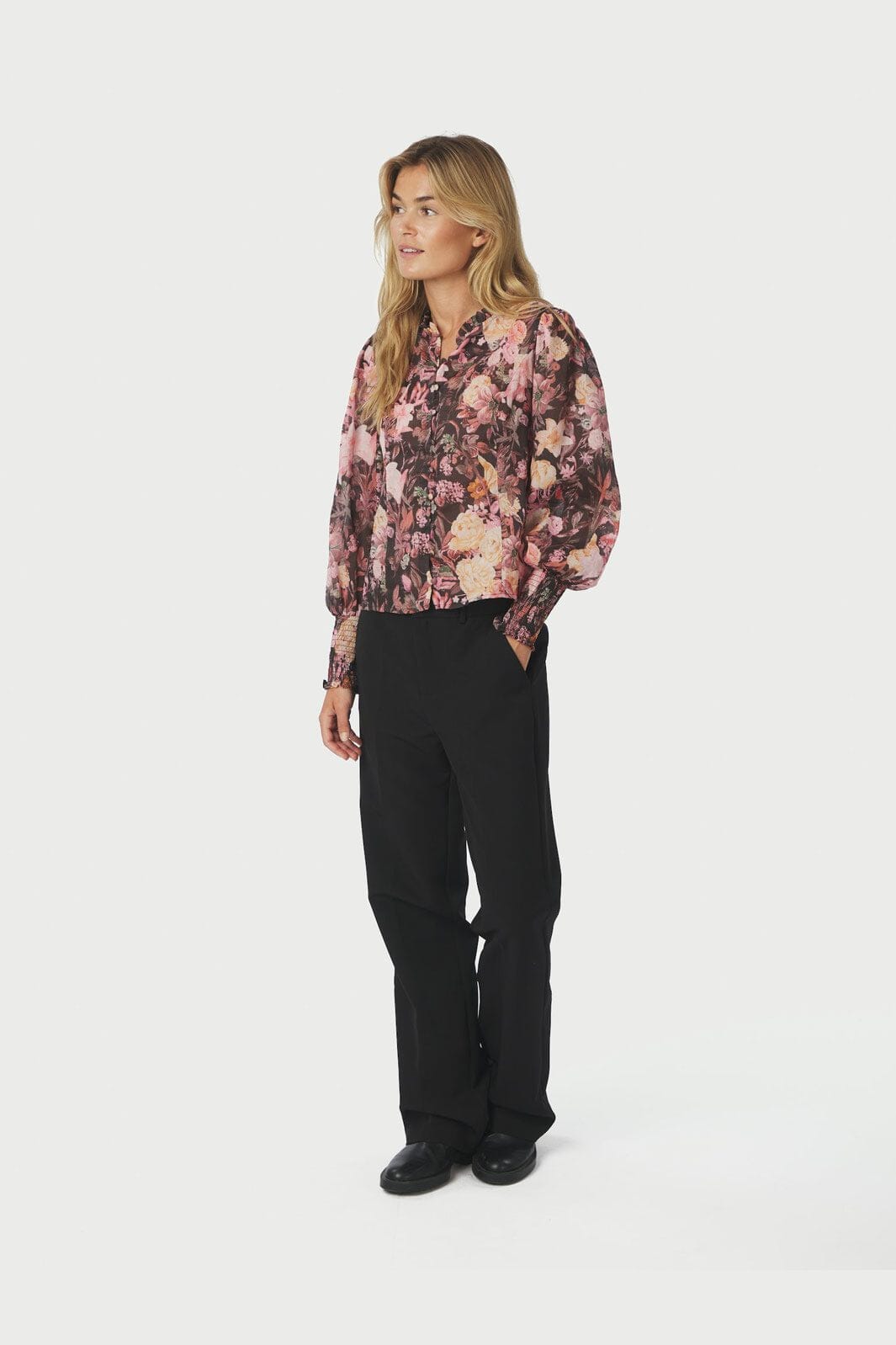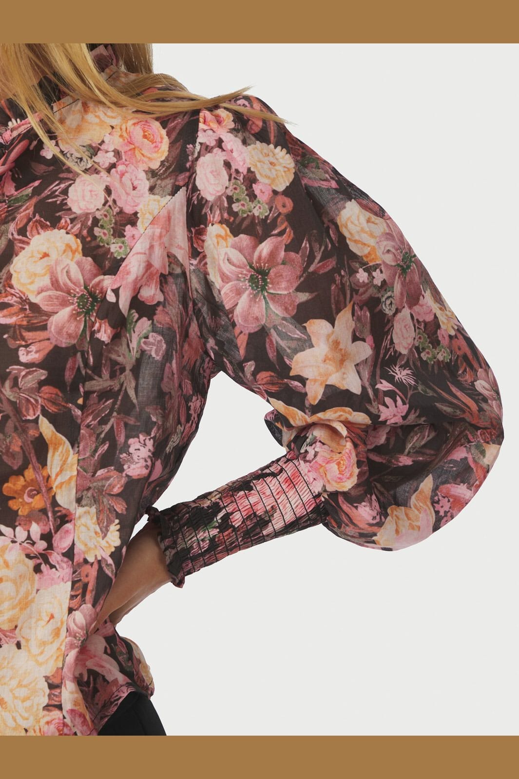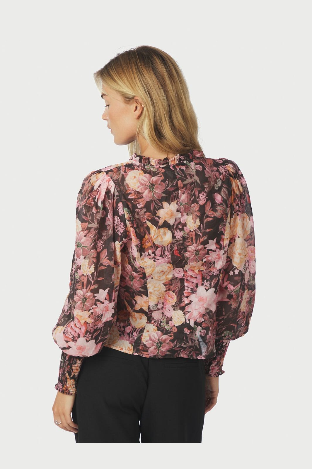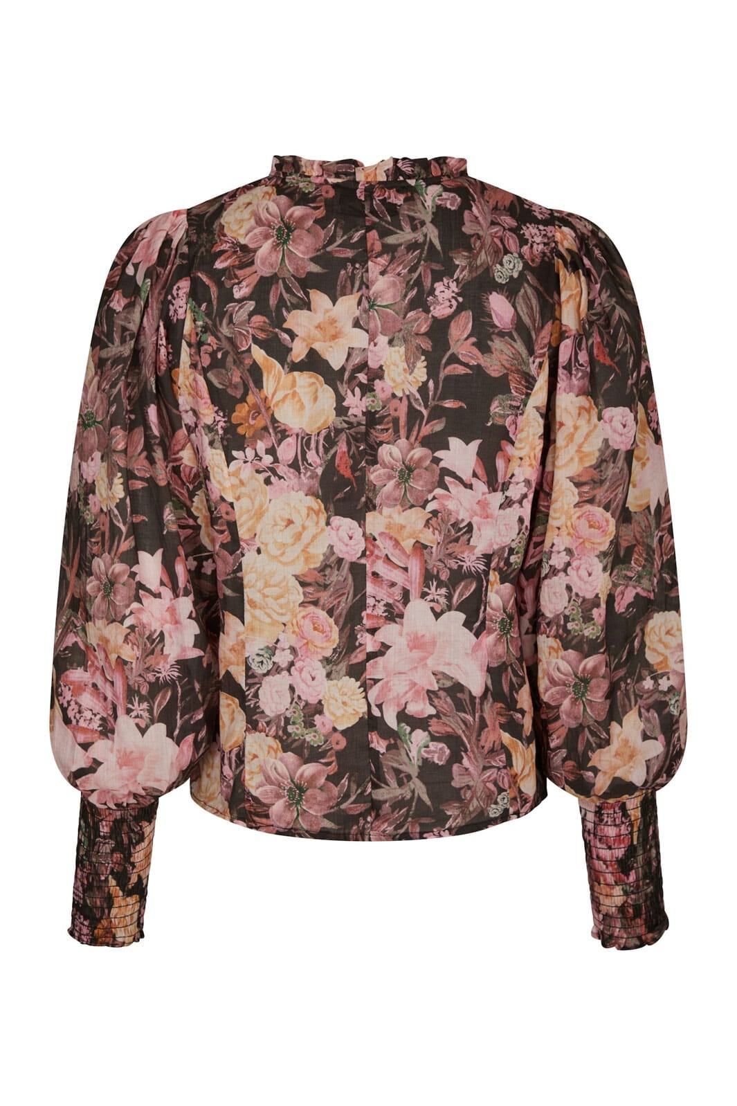 Zwarte blouse van Neo Noir met bloemenpatroon in roze en crème tinten. De blouse heeft een hoge hals met ruches, puffmouwen en knoopsluiting aan de voorkant.