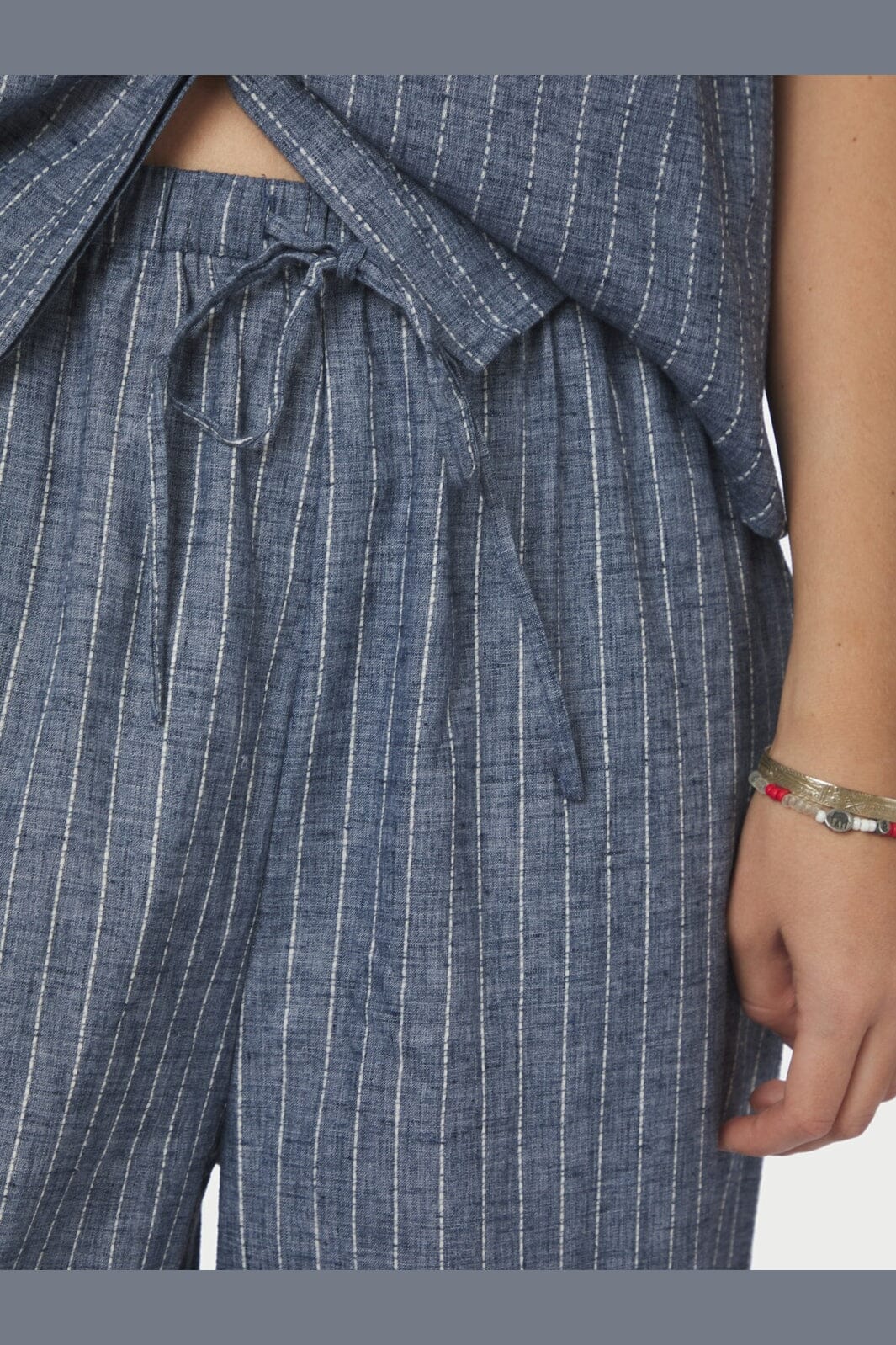 Blauwe broek van Neo Noir met verticale strepen. De broek is gemaakt van katoen en heeft borduursel en koorddetails die zorgen voor een bijzonder karakter.