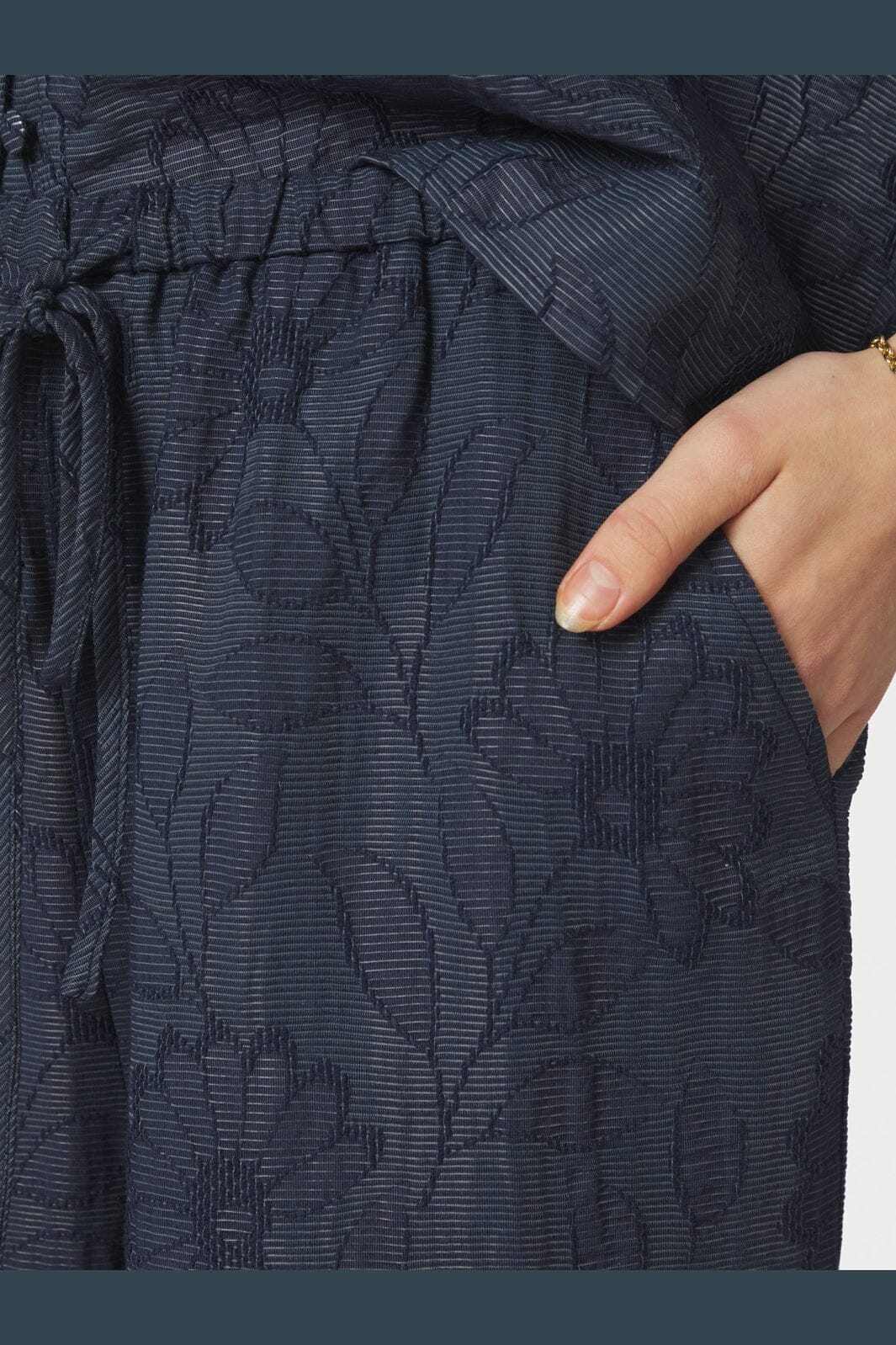 Donkerblauwe broek van Neo Noir met een bloemenstreeppatroon. De broek heeft een losse pasvorm en een hoge taille met elastiek en trekkoord.