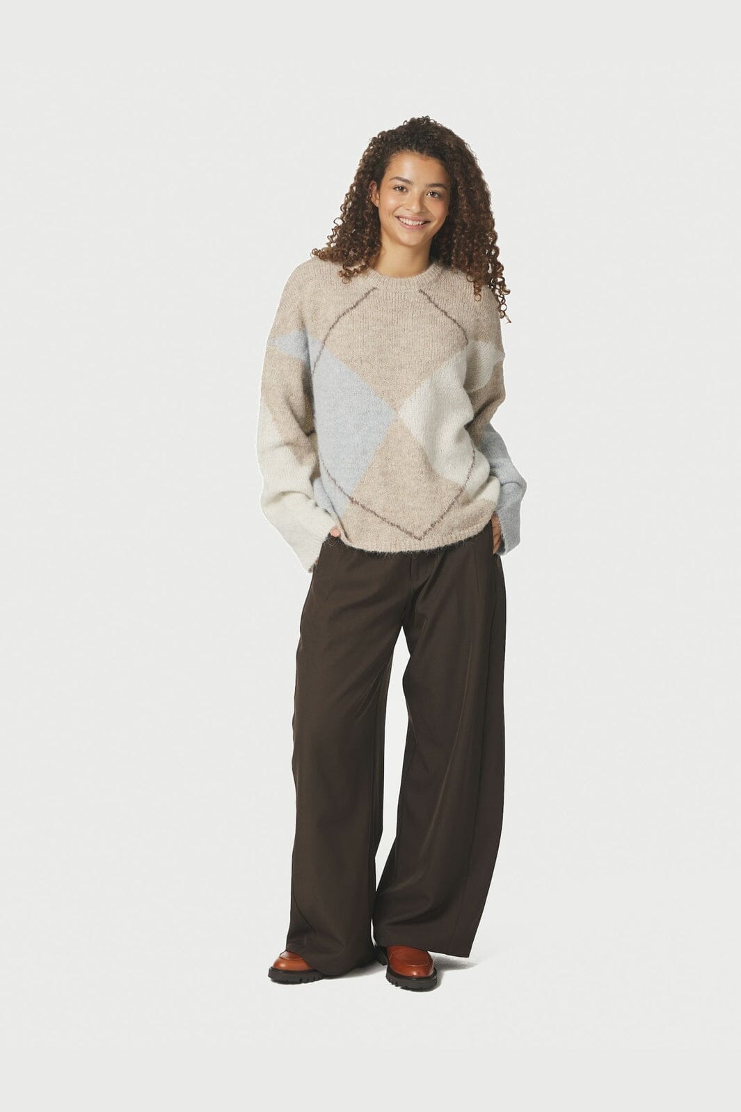 Gebreide blouse van Neo Noir met een geruit argyle-patroon in beige, lichtblauw en wit. De blouse heeft een zachte kwaliteit met een fluffy look.