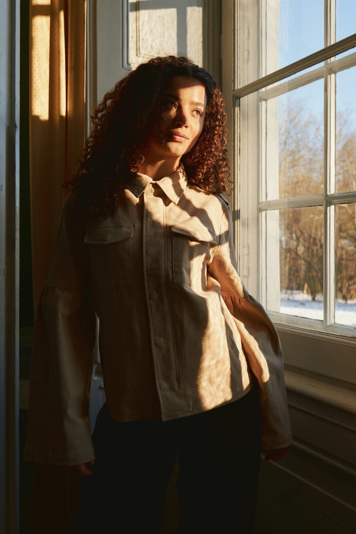 Zandkleurig jack van Neo Noir, gemaakt van 90% katoen, 8% polyester en 2% elastaan. Het jack heeft een klassieke overhemdkraag, twee borstzakken met kleppen en lange mouwen met een puffdetail bij de schouders.