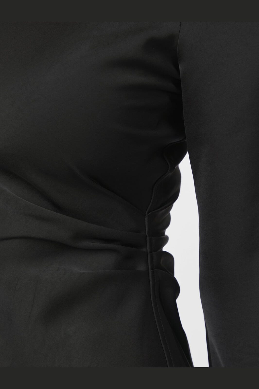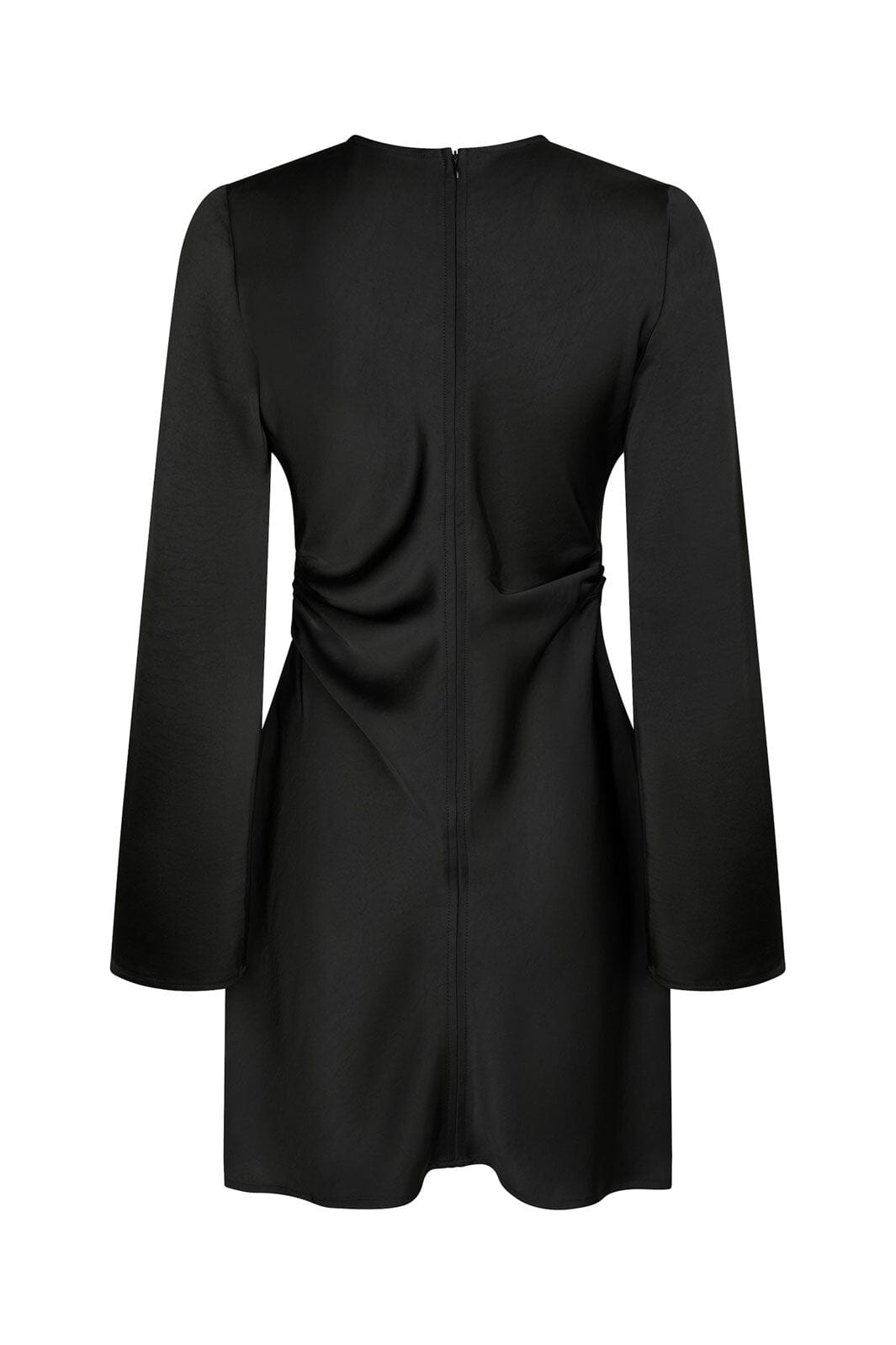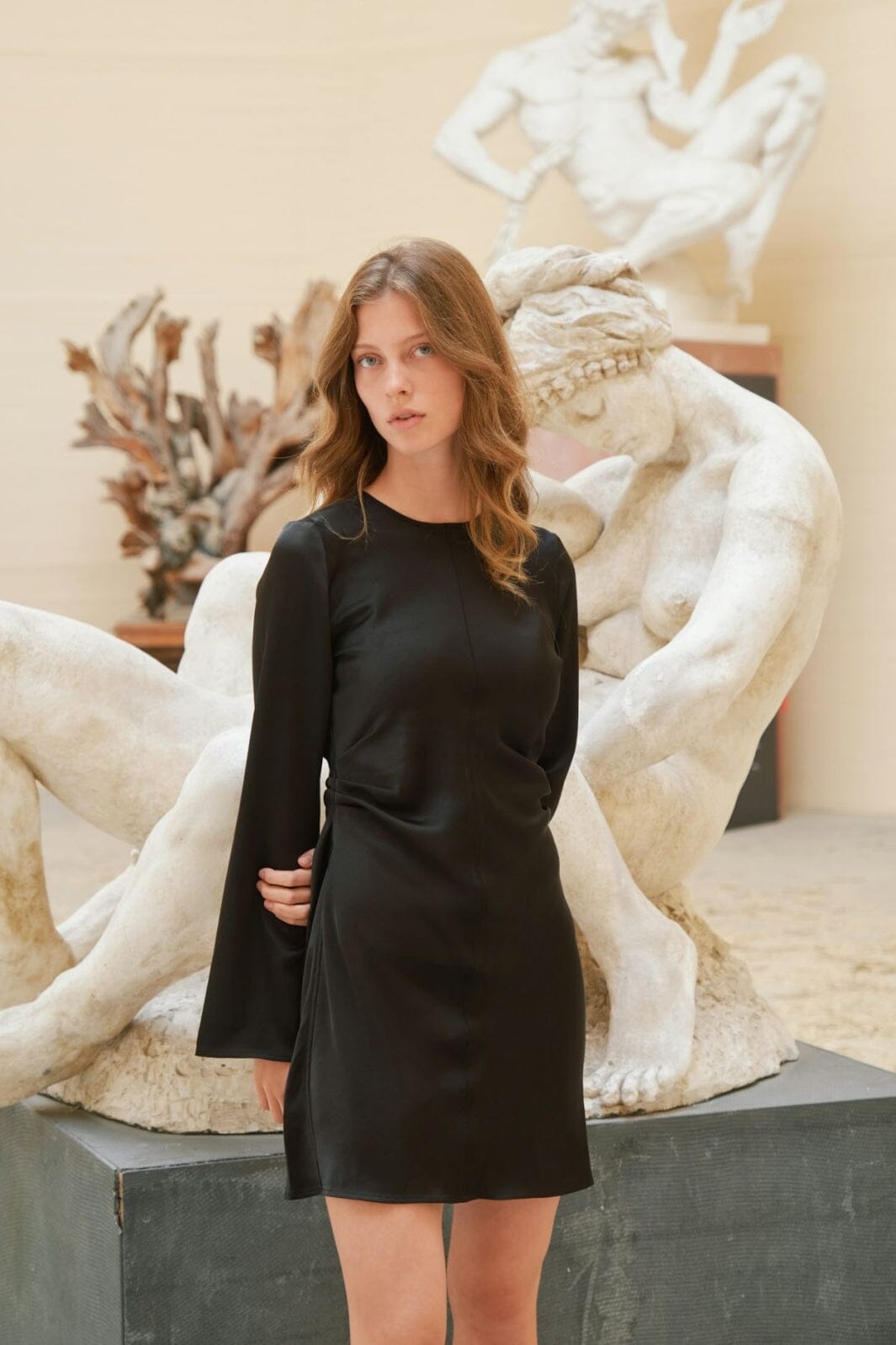 Zwarte satijnen jurk met een aansluitende silhouet en lange mouwen. De jurk heeft ruchesdetails en wijdte in de mouwen. Een rits aan de achterkant maakt het gemakkelijk om aan en uit te trekken.