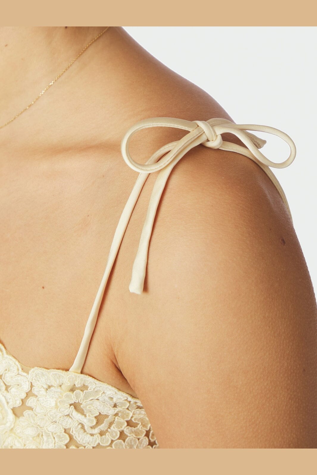 Lichtgele top van Neo Noir, gemaakt van zware satijn met kanten details. De top heeft dunne strikbandjes op de schouders en een lichte uitloop aan de onderkant.