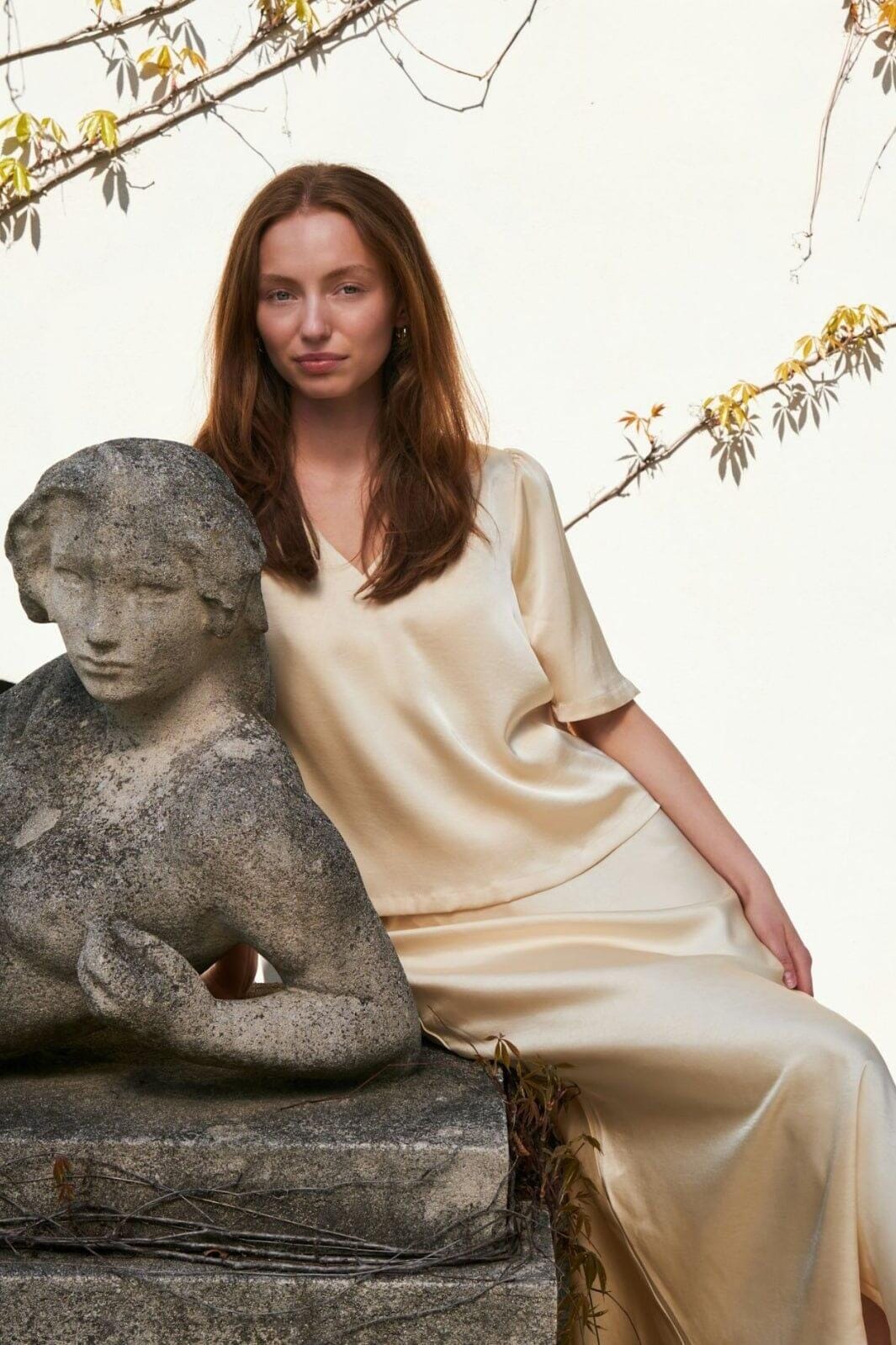 Lichtgele blouse van Neo Noir in satijnkwaliteit. De blouse heeft korte mouwen, schoudervullingen en een v-hals. De satijnen stof geeft een glanzende uitstraling die zowel geschikt is voor dagelijks gebruik als voor feesten.